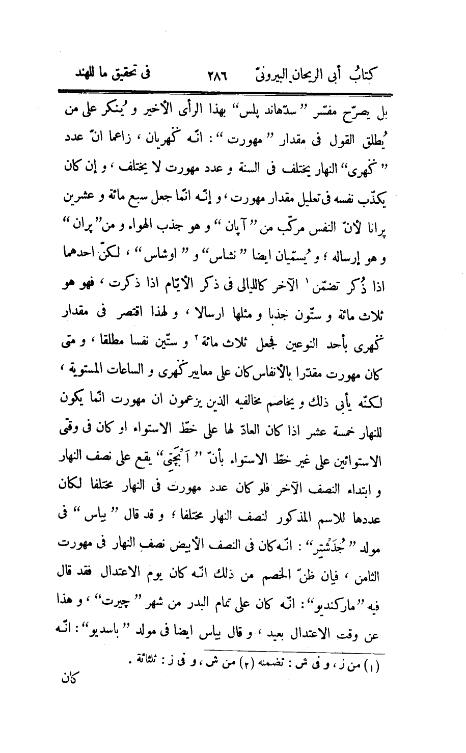 اضافة الماضي من سني كلبنا اليها ضرب المنّنترات الماضية التامّة في اثنين وسبعين كاعتقاده وما بلغ في سني «جترجوك» فاجتمع سنوها 1866240000 وضرب عدّة الجترجوكات التامّة الماضية من المنّنتر المنكسر في سني واحد منها فاجتمع 116640000، وقد مضى من الجترجوك المنكسر ثلاثة من الجوكات وسنوها عنده 3240000، وهذا العدد هو ثلاثة ارباع سني جترجوك، واستعملها كذلك في اعتبار الموقع من الأسبوع بأيّامها مستشهدا، ولو كان يعتقد القانون المتقدّم لاستعمله في موضع الحاجة ولأخذ للجوكات الثلاثة تسعة اعشار جترجوك، فقد استبان ان لا اصل لما حكاه «برهمكوبت» عنه ورضيه وإنّما عمى عن هذا لبغضه «آرجبهد» وإفراطه في الدقّ عليه، وهو و «بلس» على امر واحد من هذا المعنى، يشهد لقولي قوله: انّ ارجبهد نقص من ادوار الرأس وأوج القمر ففسدت اعمال الكسوف بفساد الأدوار، ومثّله في جهله بذلك مثل السوس تأكل الخشبة فيتصوّر فيها من تأكلها ما يشبه الحروف وهي لا تعرفها ولا تقصدها، ولكنّ من تحقّقها قام بازاء «ارجبهد» و «اشريخين» و «بشنجندر» كالأسد حيال الظباء، فلم يمكنهم ان يظهروا له ويروه وجوههم، وبهذا الصلف انحى على ارجبهد وظلمه؛ وقد ذكرنا مقدار «جترجوك» بالأيّام الطلوعيّة عند الثلاثة، فزيادة رأي «بلس» على رأي «برهمكوبت» في الأيّام 1350 لكنّ عدد سني جترجوك عندهما واحد، فأيّام السنة الشمسيّة عند بلس لا محالة اكثر منها عند برهمكوبت، وبحسب حكايته عن ارجبهد يكون نقصان رأيه عن رأي بلس في الأيّام 300 وزيادة رأيه على رأي برهمكوبت فيها 1050، فأيّام سنة الشمس عنده تكون اكثر منها عند برهمكوبت وأقلّ منها عند بلس.