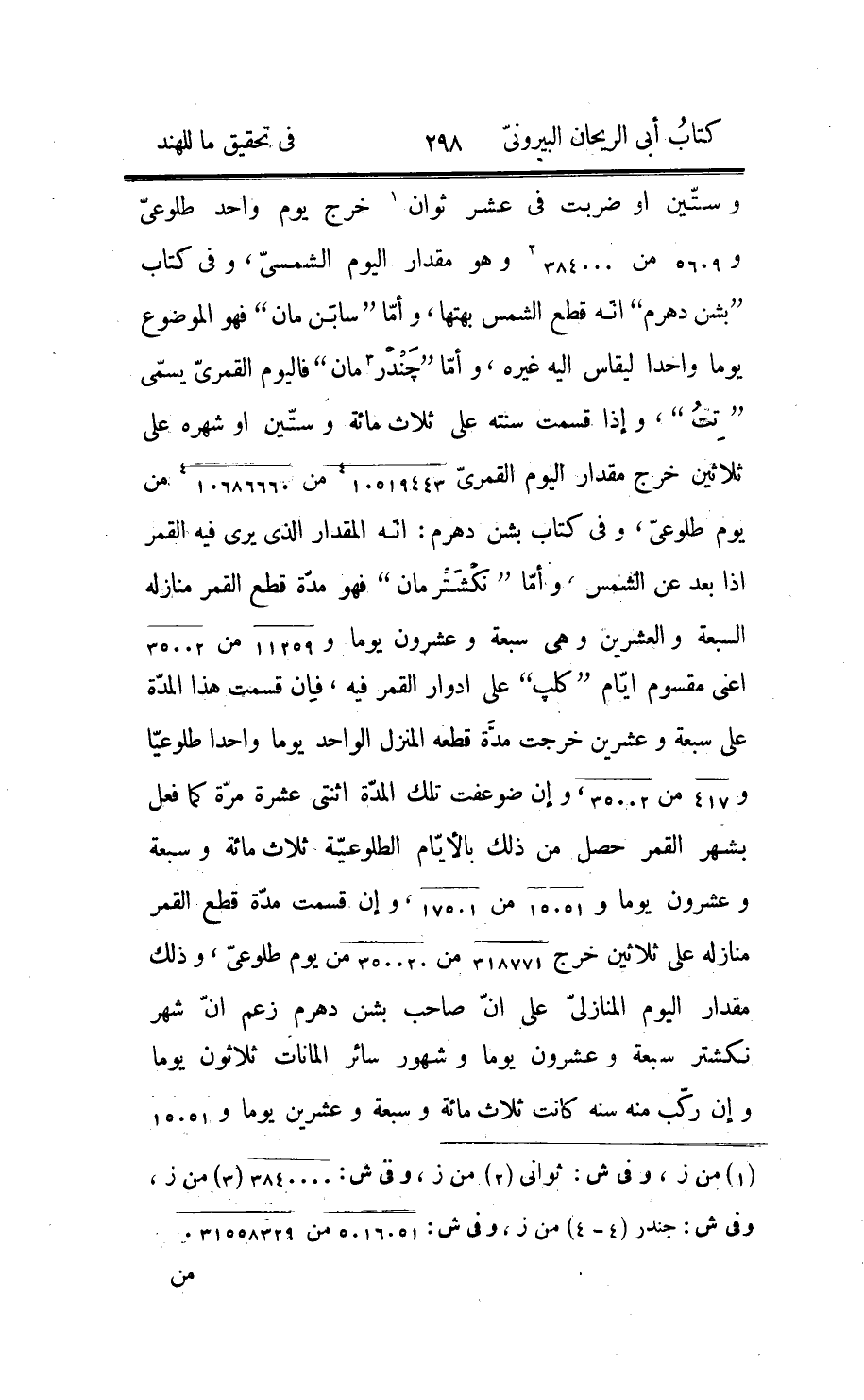 برج وعشرين درجة؛ ومن الذي يمكنه تحصيل أقاويلهم المختلفة على ظهر المغيب عنهم! فنهب أوّلا ان كرك صادق وإن لم يبيّن الموضع من مك فنضعه نحن أوّله وضعا وذلك أوّل الأسد، ومن زمان جذشتر الى سنتنا التي هي 1340 للاسكندر 3479، ونصدّق أيضا «براهمهر» في مكث بنات نعش في كلّ منزل ستّ مائة سنة، فيكون موضعه لسنتنا في الميزان ستّ درجات وسبع عشرة دقيقة «1» وذلك في منزل «أسوات» عشر درج وثمان وثلاثين دقيقة، فإن فرضنا ما وضعنا في نصف «مك» انتهينا الى ثلاث درج وثمان وخمسين دقيقة من «بشاك» ، وإن فرضناه في آخر مك انتهينا الى عشر درجات وثمان وثلاثين دقيقة من بشاك، فليس ما ذكر في التقويم الكشميري بموافق لما «2» في «سنكهت» ، وكذلك ان جعلنا الموضع ما في التقويم ورجعنا منه بهذا المسير الى الوراء لم ننته الى مك بتّة؛ وقد كنّا نستعظم سرعة الثوابت في زماننا وبطوءها فيما تقدّم ونتطلب لها وجوها في هيئة الفلك، وحركتها عندنا درجة في كلّ ستّ وستّين شمسيّة، فصار أمر «براهمر» أعجب لأنّه يقتضي حركتها درجة في خمس وأربعين سنة وزمانه يتقدّم زماننا بقريب من خمس مائة وخمس وعشرين سنة؛ وفي زيج «كرن سار» لحركة بنات نعش ومعرفة موضعه أمر صاحبه ان ينقص من «شككال» 821، فيبقى الأصل وهو ما زاد على تمام أربعة آلاف «3» سنة من أوّل «كلجوك» ، ثمّ يضرب الأصل في 47 ويزاد على المبلغ 68000، ويقسم المبلغ على عشرة آلاف «3» ، فيخرج بروج وما يتلوها وذلك موضع بنات نعش، أمّا الزيادة فهي بالضرورة موضع بنات نعش لأوّل الأصل مضروب في عشرة آلاف «3» ، فإن قسمت الزيادة عليها خرج ستّة بروج وأربع وعشرون درجة؛ ومعلوم أنّا قسمنا العشرة الآلاف «3» على السبعة والأربعين خرجت مدّة حركة البرج الواحد في مائتين «4» واثنتي عشرة سنة وتسعة