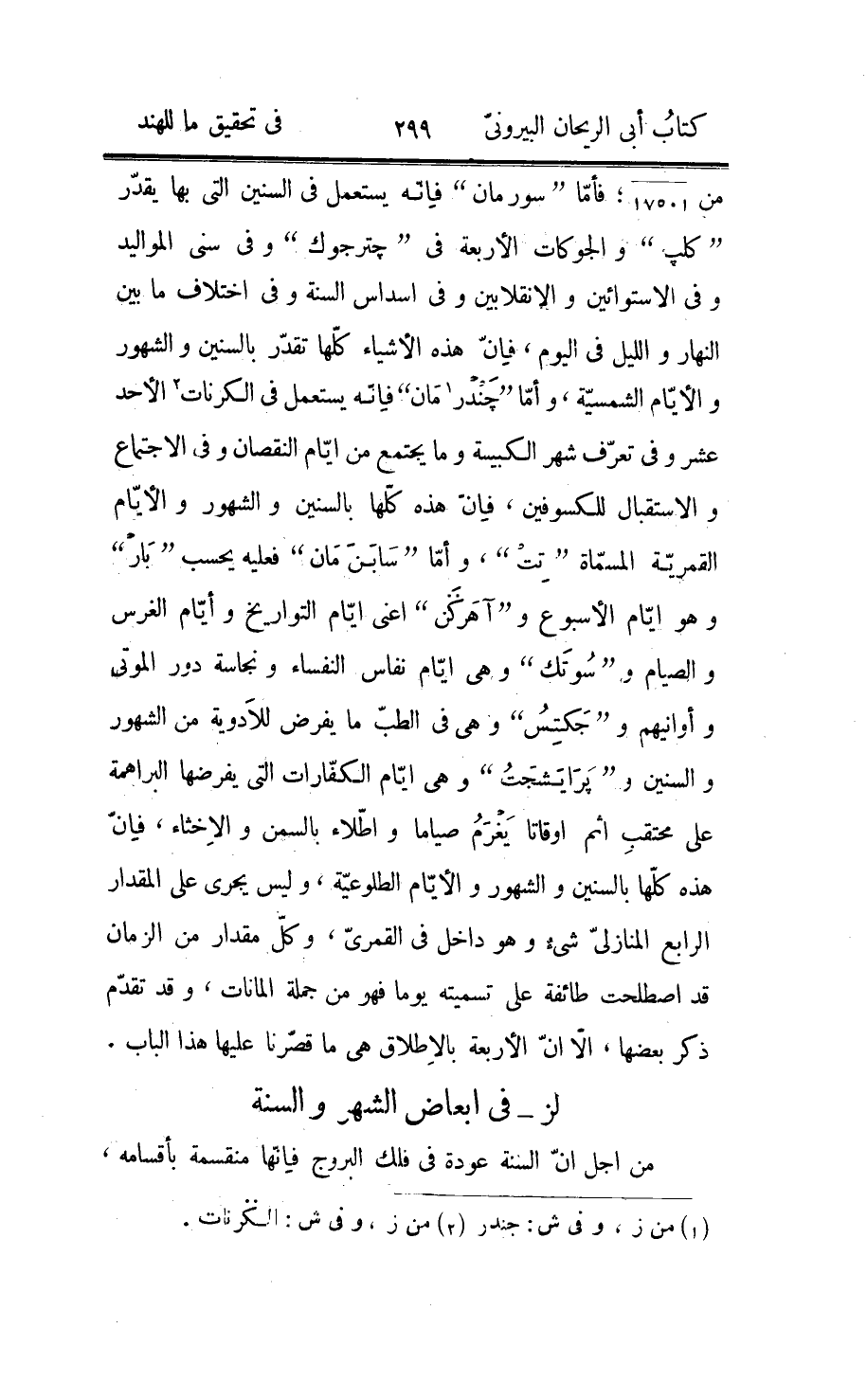أشهر وستّة أيّام شمسيّة، فحركة الدرجة تكون في سبع سنين وشهر وثلاثة أيّام والمنزل في أربع وتسعين سنة وستّة أشهر وعشرين يوما، فشتّان بين «براهمهر» و «بتيشفر» ان لم يكن في النقل خطأ، وإذا امتثلنا هذا العمل لسنتنا خرج في «انراد» تسع درجات وسبع عشرة دقيقة، وكان أهل «كشمير» يعتقدون في حركة بنات نعش أنّها للمنزل مائة سنة، فقد كان في التقويم المذكور انّ الباقي له الى تمام المائة ثلاث وعشرون سنة؛ وهذا كلّه من عدم الرياضة بأحوال الهيئة وتمزيجه بالأخبار الملّيّة، فأصحابها منهم يعتقدون في بنات نعش أنّه أعلى من مواضع الثابتة ويزعمون أنّ في كلّ «منّنتر» يتجدّد «من» فيملك أولاده الأرض ويتجدّد بأندر الرئاسة وكذلك طوائف الملائكة وبنات نعش، أمّا الحاجة الى الملائكة فليعمل الناس لهم قرابين ويوصلون الى النار انصباءهم وأمّا الحاجة الى بنات نعش فليجدّدوا «بيذ» فإنّه يبيد في آخر كلّ منّنتر، وهذا الفصل هو من «بشن بران» ، ومنه نقلنا ما وضعناه في الجدول من أسماء بنات نعش في كلّ منّنتر: