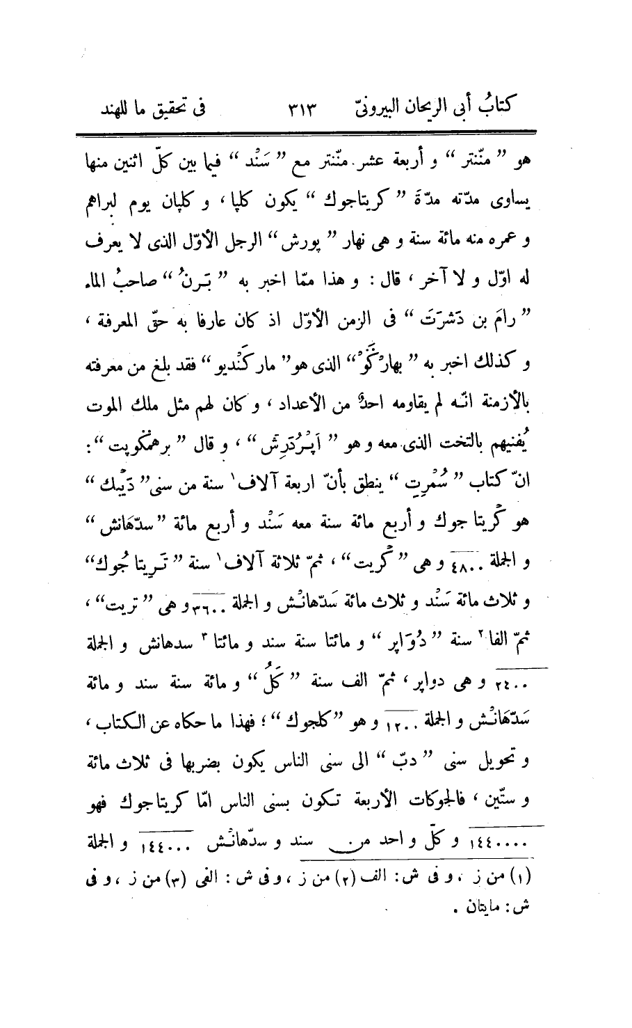 «براهم» ، فأجابه بأنّ الماضي منه ثماني «1» سنين وخمسة اشهر وأربعة ايّام وستّة «منّنتر» وسبعة «سند» وسبعة وعشرين جترجوكا وثلاثة «جوك» من الثامن والعشرين وعشر سنين من سني «دبّ» الى وقت «اشميت» الذي عملته انت قال ومن احاط بتفصيل ذلك وتصوّره حقّ التصوّر كان عارفا والعارف هو الذي يخدم الربّ الواحد ويطلب جوار مكانه المسمّى «برم بذ» ، وإذا كان ما ذكره معلوما وقد اشرنا الى مقادير هذه الأشياء اشارة كافية يستبين منها انّ الماضي من عمر «براهم» الى الوقت الذي فرضناه للمثال بسنينا 26215732948132 «2» ، ومن يومه الذي هو «كلب» النهار 1972948132 ومن منّنتر السابع 120532132، وهو ايضا تأريخ حبس «بل» الملك لأنّه كان في اوّل «جترجوك» من منّنتر السابع؛ وكلّ ما ذكرناه ونذكره في التواريخ فهو سنوها التامّة اذ لم يجر لهم رسم باستعمال السنة المنكسرة فيها، وفي كتاب «بشن دهرم» : قال «ماركنديو» في جواب «بجر» : قد مضى عليّ ستّة كلب ومن السابع ستّة منّنتر ومن السابع ثلاثة وعشرون «تريتا جوك» وفي الرابع والعشرين قتل «رام» «راون» وقيل «لكشمن» اخو «3» «رام كهنبكرن» اخا «3» راون وقهرا جميع «راكشس» ، وحينئذ عمل «بالميك» «4» الرش حديث «رام وراماين» وخلّده في الكتب، وحدّثت انابه «جذشتر بن باندو» في مشجرة «كامكبن» ؛ فأمّا تعديده «تريتاجوك» فلانّ الأحوال المذكورة كانت فيه وأيضا فإنّ التعديد بالواحد اولى من واحد يفصح بأربعة، وآخر تريتاجوك اولى بتلك الأحوال من اوّله لاقترابه من الشرّ، ولا شكّ انّ تأريخ «رام وراماين» عندهم معلوم ولكنّه لم يقع الينا، وسنو ثلاثة وعشرين جترجوكا تكون 99360000 وإلى آخر تريتاجوك تكون 102384000، فإذا