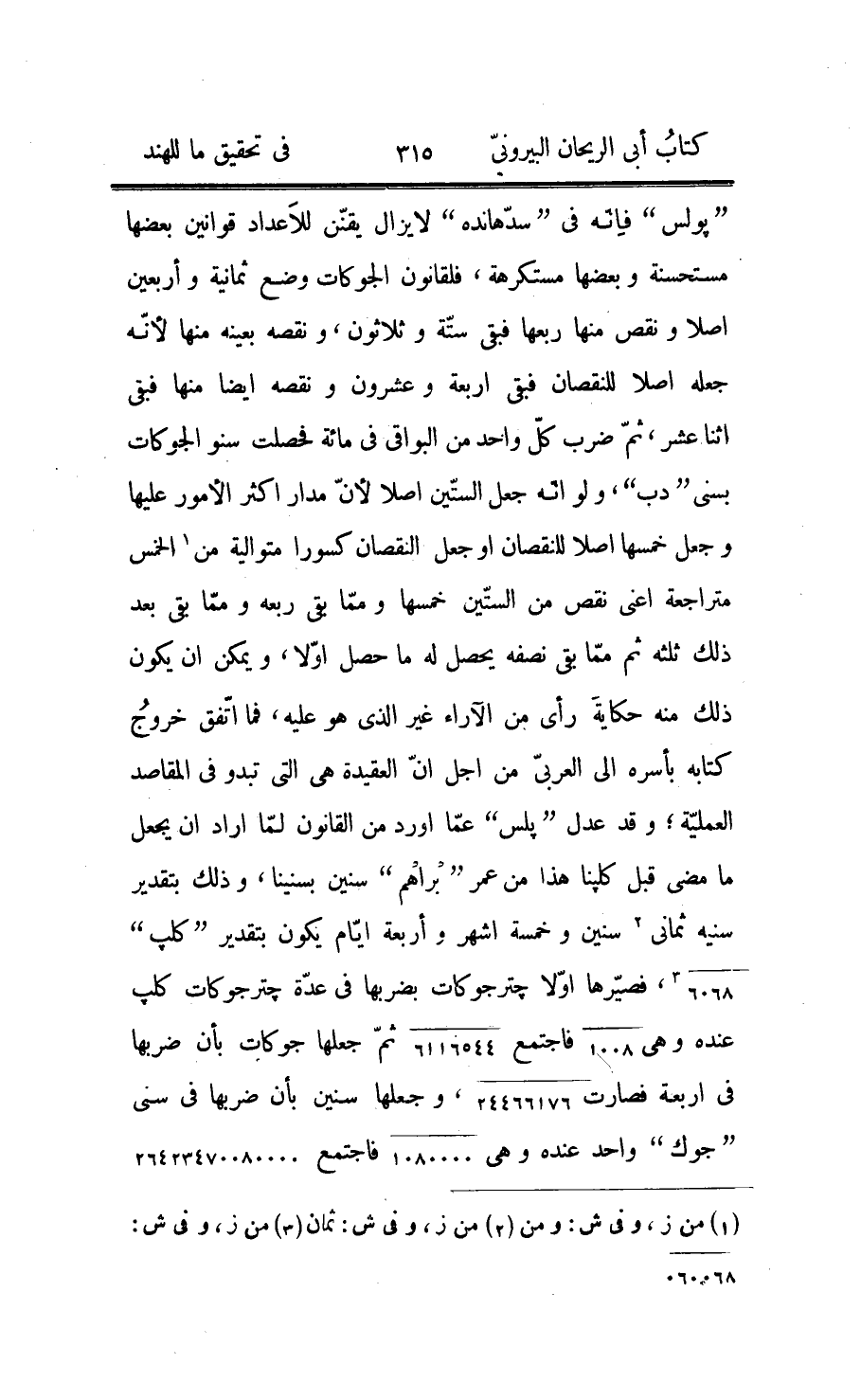 لمهاديو «جندربير» ، وفيما يعملونه تكلّف اوّلا ولو انهم وضعوا في اوّل الأمر 1026 كما وضعوا 342 بغير علّة موجبة لكان مجزيا، وهب انّه اطّرد في «سنبجر» واحد فما الطريق فيه اذا تضاعف؟ وأمّا تأريخ شق وهو «شككال، فهو متأخّر عن بكرمادت 135، وكان شق المذكور متغلّبا على ما بين نهر السند وبين البحر من ارضهم قد جعل مستقرّة «آرجابرت» في الواسطة، وحظر عليهم الانتساب الى غير الشقيّة، فمنهم من زعم انّه كان شودرا من مدينة المنصورة ومنهم من زعم انّه لم يكن هنديّا وإنّما جاءهم من ناحية المغرب، وكانوا منه في بلاء شديد الى ان اتاهم الغياث من نواحي المشرق بقصد «بكرمادت» ايّاه حتى هزمه وقتله بناحية «كرور» التي بين «مولتان» وقلعة «لوني» ، فاشتهر الوقت بحسب الاستبشار بقتله وأرّخ به وخاصّة المنجّمون منهم، وألحقوا «شري» باسم بكرمادت اجلالا له، ولامتداد المدّة بين «1» التأريخ الذي اضفناه اليه وبين مقتل «شق» اظنّ انّه ليس بالقاتل وإنّما هو سمّي له؛ وأمّا تأريخ «بلب» وهو صاحب مدينة «بلبه» وهي جنوبيّة عن مدينة «انّهلواره» بقريب من ثلاثين «جوزن» ، فإنّ اوّله متأخّر عن تأريخ شق بمائتين «2» وإحدى وأربعين سنة، ومستعملوه يضعون «شككال» وينقصون منه مجموع مكعّب الستّة ومربّع الخمسة، فيبقى تأريخ بلب، وخبره آت في موضعه، وأمّا «كوبت كال» فكانوا كما قيل قوما اشرارا اقوياء فلمّا انقرضوا ارّخ بهم، وكأنّ بلب كان اخيرهم فإنّ اوّل تأريخهم ايضا متأخّر من شككال 241، وتأريخ المنجّمين يتأخّر عن شككال 587، وعليه بنى زيج «كندكاتك» لبرهمكوبت وهو المعروف عندنا بالأركند؛ فإذن سنو تأريخ «شري هرش» لسنتنا الممثّل «3» بها 1488 وتأريخ بكرمادت 1088 وشككال 953 وتأريخ بلب الذي هو ايضا كوبت كال 712 وتأريخ زيج كندكاتك 366 وتأريخ «بنج سدهاندك»