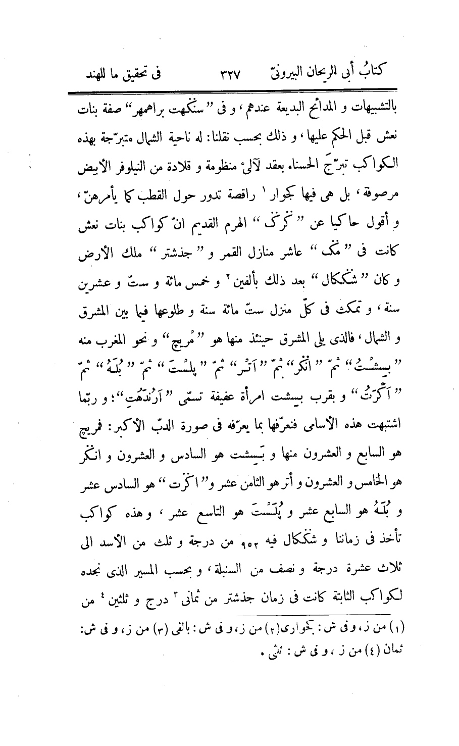وهو «اونّراتر» ، ومعنى «أون» هو النقصان، وإنّ زيادة «سور» على جندر احد عشر يوما فيجتمع منه في سنتين وسبعة أشهر شهر «ادماسه» الزائد، وكلّ هذا الشهر منحوس يجب ان لا يعمل فيه شيء؛ وهذا كلام هو بالجليل، وإنّما تحقيقه انّ سنة القمر بأيّامه ثلاث مائة وستّون وسنة الشمس بها ثلاث مائة وأحد وسبعون يوما وأحد وثلاثون جزءا من أربع مائة وثمانين جزءا من يوم، فبحسب الفضل بينهما يجتمع ثلاثون يوما لأدماسه في 976 و 4156 من 47799 من يوم قمريّ وذلك اثنان وثلاثون شهرا اعني سنتان، وثمانية اشهر وستّة عشر يوما ثمّ الكسر الذي ذكرناه وهو بالتقريب خمس دقائق وثلاث عشرة ثانية؛ وأمّا الأمر الشرعيّ الموجب لذلك فقد قرىء علينا من «بيذ» ما هذا معناه: إذا مضى يوم الاجتماع وهو أوّل الأيّام القمريّة من الشهر خاليا عن انتقال الشمس من برج الى برج ثمّ كان في اليوم التالي لها انتقال فإنّ الشهر الذي قبله ساقط من الحساب، وهذا لا يصحّ وكان الأمر فيه من القارئ المترجم، وذلك انّ الشهر بالأيّام القمريّة ثلاثون يوما ونصف سدس السنة الشمسيّة بهذه الأيّام ثلاثون يوما و 5311 من 5760، وذلك بدقائق الأيّام نه يط كب ل، فإذا فرضنا للمثال الاجتماع في أوّل برج فأخذنا نزيد هذه الكسور على وقت ذلك الاجتماع مرّة بعد اخرى ظهرت اوقات انتقالات الشمس في البروج بعده، ولأنّ فضل ما بين شهري النيّرين هو كسر اقلّ من اليوم فإنّ من الممتنع أن يخلو يوم في الشهر عن انتقال بل ربّما اجتمع انتقالان متواليان في يوم منه بعينه، وذلك حين يتّفق المتقدّم منهما من اليوم في أقلّ من. د م لز ل فإنّ التالي يتّفق «1» ضرورة في مثل ذلك الكسر المذكور لا يفي بإتمامه يوما، فإذن الحكاية عن «بيذ» غير صحيحة؛ والذي اتفرّس في صحّتها انّها هكذا إذا مضى شهر ولم يكن للشمس فيه انتقال من برج إلى آخر فإنّ ذلك الشهر ساقط عن الحساب، وذلك لأنّ الانتقال إذا اتّفق من اليوم التاسع والعشرين فيما ليس بأقل من د م لز ل تقدّم الانتقال الشهر الذي بعده فخلا عن الانتقال