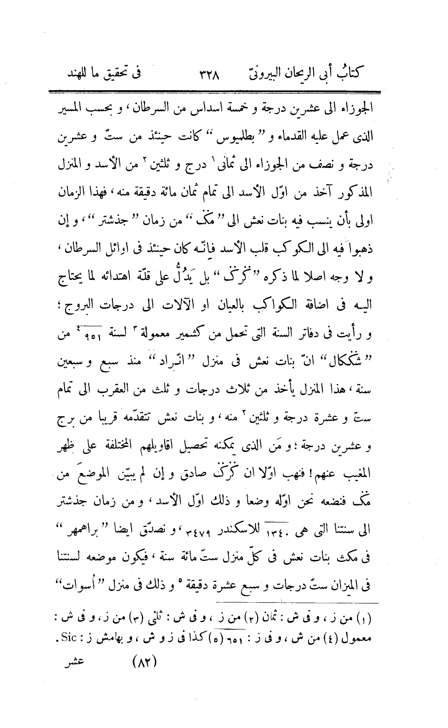 من اجل انّ الانتقال الثاني يقع في اليوم الأوّل من الشهر الثالث، وإذا استقريت «1» الانتقالات المتوالية التي ركّبتها على اجتماع المثال وجدّت الذي في الشهر الثالث والثلاثين في ل ك من اليوم التاسع والعشرين والذي يتلوه في كه لط كب ل من اليوم الأوّل من الشهر الخامس والثلاثين، وعلم مع ذلك سبب التشاؤم بهذا الشهر الملغى، لأنّه يتعرّى عن الوقت المرشح لاكتساب الثواب؛ وأمّا «ادماسه» فإن كان اشتقاق الاسم من الشهر الأوّل لأنّ «آد» هو المبدأ، فقد يجيء هذا الاسم في كتابي يعقوب بن طارق والفزاريّ «بذماسه» و «بذ» «2» هو النهاية فيجوز ان يسمّيه هند بهما كذلك على أنّ الرجلين مصحّفان لا يعتمد روايتهما، وإنّما ذكرت هذا لأنّ «بلس» صرّح في الأخير من الشهرين السميّين بأنّه الزائد؛ وأمّا الشهر من الاجتماع الى مثله فإنه عودة للقمر حاصلة متباعدة عن الشمس على توالي البروج إليها وهو الفضل بين حركتيهما لأنّهما الى جهة واحدة، فعودات الشمس في «كلب» أعني أدوارها إذا القيت من عودات القمر فيه تبقى الشهور القمريّة في كلب لا محالة، وكلّ ما كان في كلّ كلب فلنسمّه بالكل تسهيلا وما كان في بعضه فبالجزء، وشهور السنين الشمسية اثنا عشر شمسيّة، وشهور القمر كذلك امّا في سنة نفسه فإنّه يستغرقها، وأمّا في سنة الشمس فللفضلة التي بين السنتين تصير شهور السنة في «ادماسه» ثلاثة عشر، فمعلوم انّ فضل ما بين شهور النيّرين الكليّة هي تلك الشهور الزائدة التي بها تصير السنة ثلاثة عشر شهرا، فهي اذن شهور ادماسه الكليّة؛ فأمّا شهور الشمس الكليّة فهي 51840000000 وأمّا شهور القمر الكليّة فهي 53433300000، وفضل ما بينهما وهو شهور ادماسه 1593300000 «3» ، فإذا ضرب كلّ واحد من ذلك في ثلاثين صار أيّاما امّا أيّام الشمس فإنّها 1555200000000