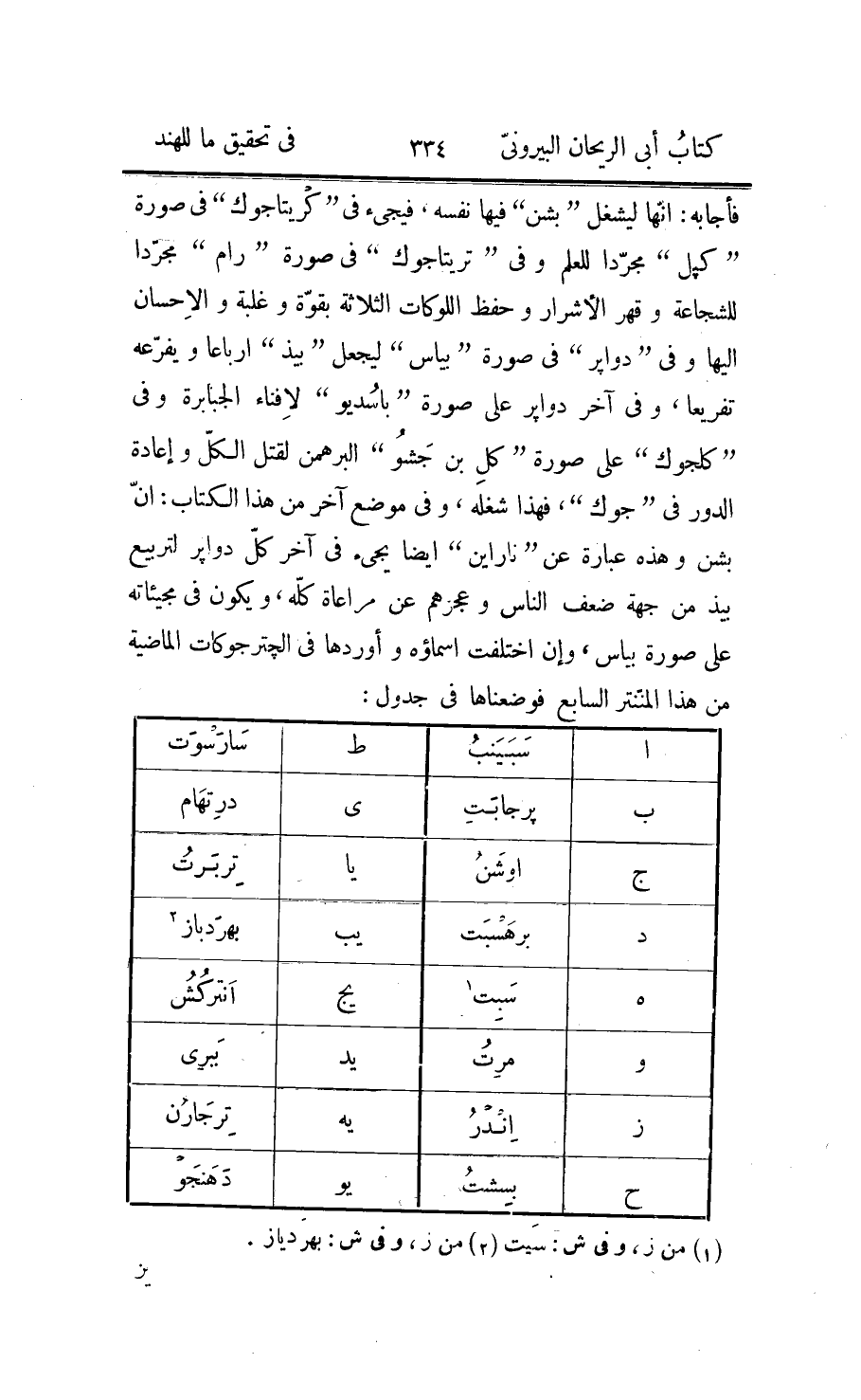 هذين الاسمين يعمّ كلّ مضروب فيه في جميع الأعمال، وربّما يجيء في زيجاتنا وزيجات الفرس «كنجار» ، والثاني من الاسمين يعمّ كلّ مقسوم عليه وهو الذي يجيء في الزيجات «بهجار» ، ولا فائدة في أن نمثّل بجترجوك «1» على مذهب «برهكوپت» لأنّه جزء من ألف جزء من «كلب» ، فيسقط له من جميع ما ذكرنا ثلاثة أصفار ويرجع بالوفق الى الأعداد المذكورة، ولكنّا نعمله على رأي «بلس» لأنّه وإن كان في «جترجوك «2» » فإنّه يشابه العمل في كلب، ولوقت مثالنا يكون الماضي عنده من سني جترجوك «2» 3244132 وأيّامها الشمسيّة 1167887520، فإذا ضربنا شهورها في شهور «أدماسه» التي في جترجوك «2» أو في عدد الضرب النائب عنها وقسمنا المبلغ على شهور الشمس فيه أو عدد القسمة النائب عنها خرج شهور أدماسه 1961525 «3» ويبقى 44837 من 45000، ويكون بها أيّامها القمريّة 1203783270، وإذا ضربناها في أيّام النقصان لجترجوك «4» وقسمنا المبلغ على الأيّام القمريّة فيه خرج أيّام النقصان 18835700 ويبقى 598055 من 2226389 ويصير بها الأيّام الطلوعيّة من أوّل جترجوك «4» 1184947570 «5» وهي المطلوب؛ فننقل الآن من «پلس سدّهاند» عمله في مثل ما عملناه ليزيد المعنى ظهورا وفي القلب رسوخا، قال پلس: نضع ما مضى قبل كلب من عمر «براهم» وذلك 6068 كلپا، ونضربها في عدّة جترجوكات «6» كلب وهي 1008، فيجتمع 6116544، ثمّ في عدّة جوكات «7»