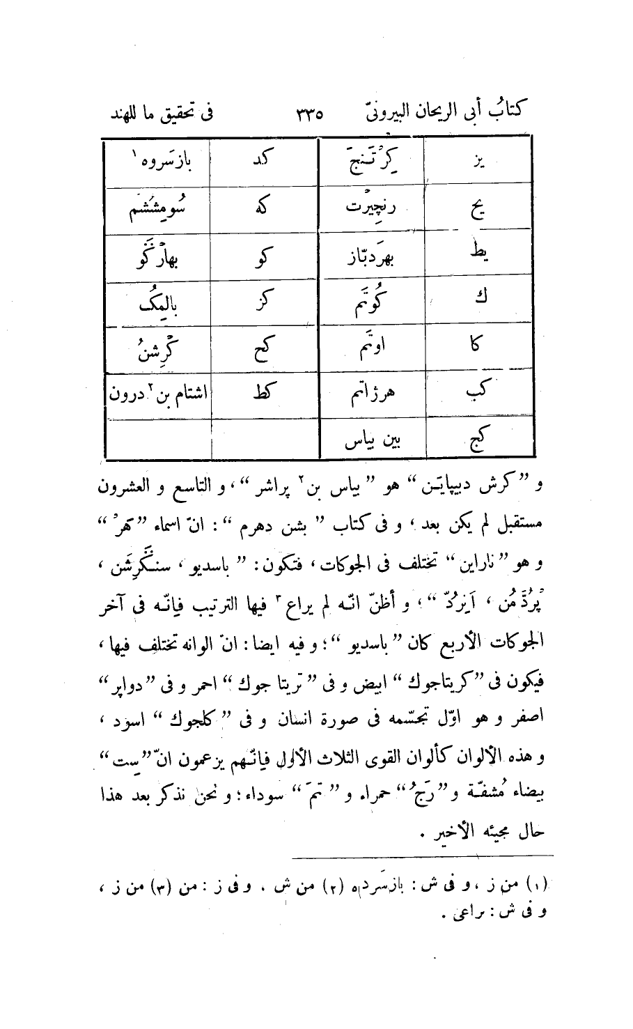 جترجوك «1» وهي أربعة فتصير 24466176، ثمّ في سني جوك «1» واحد وهي 1080000 فيجتمع 080000 «2» 26423470 «2» ، وهي سنوه قبل كلپنا، نضربها في اثنى عشر فيجتمع من الشهور 317081640960000، نضعها في موضعين، ونضرب أحدهما في عدّة شهور «أدماسه» التي في «جترجوك «3» » وهي 1593336 أو العدد الذي قدّمناه قائما مقامها ونقسم المبلغ على شهور الشمس في جترجوك «3» وهي 51840000، فيخرج شهور أدماسه 84 «4» 97457097507 «4» ، نزيدها على الموضع الآخر فيجتمع 326827450710784 «4» ، ونضربه في ثلاثين فيصير 4820521323520 «5» 980 «5» وهي أيّام قمريّة، نضعها في مكانين، ونضرب أحدهما في نقصان جترجوك «5» الذي هو فضل ما بين أيّامه الطلوعيّة والقمريّة ونقسم المبلغ على أيّامه القمريّة، فيخرج 153416869240320 «5» وذلك أيّام النقصان، فنلقيها من المكان الآخر فيبقى 9651403652083200 وهي الأيّام الماضية من عمر «براهم» قبل كلپنا أعني أيّام 6068 «كلب» لكلّ واحد 1590541142400، وإذا القيت تلك الأيّام أسابيع لم يبق منها شيء، فقد تمّت بيوم السبت وابتدأ هذا الكلب من يوم الأحد، ومعلوم أنّ مقتضى هذا أنّ أوّل عمر براهم يوم الأحد أيضا قال؛ وقد مضى من كلب المنكسر ستّة «منّنتر» كلّ واحد منها اثنان وسبعون جترجوكا «6» كلّ جترجوك «6» 4320000، فيكون جملة سنيها 1866240000، نفعل بها مثل ما تقدّم في غيره، فيحصل أيّام ستّة
