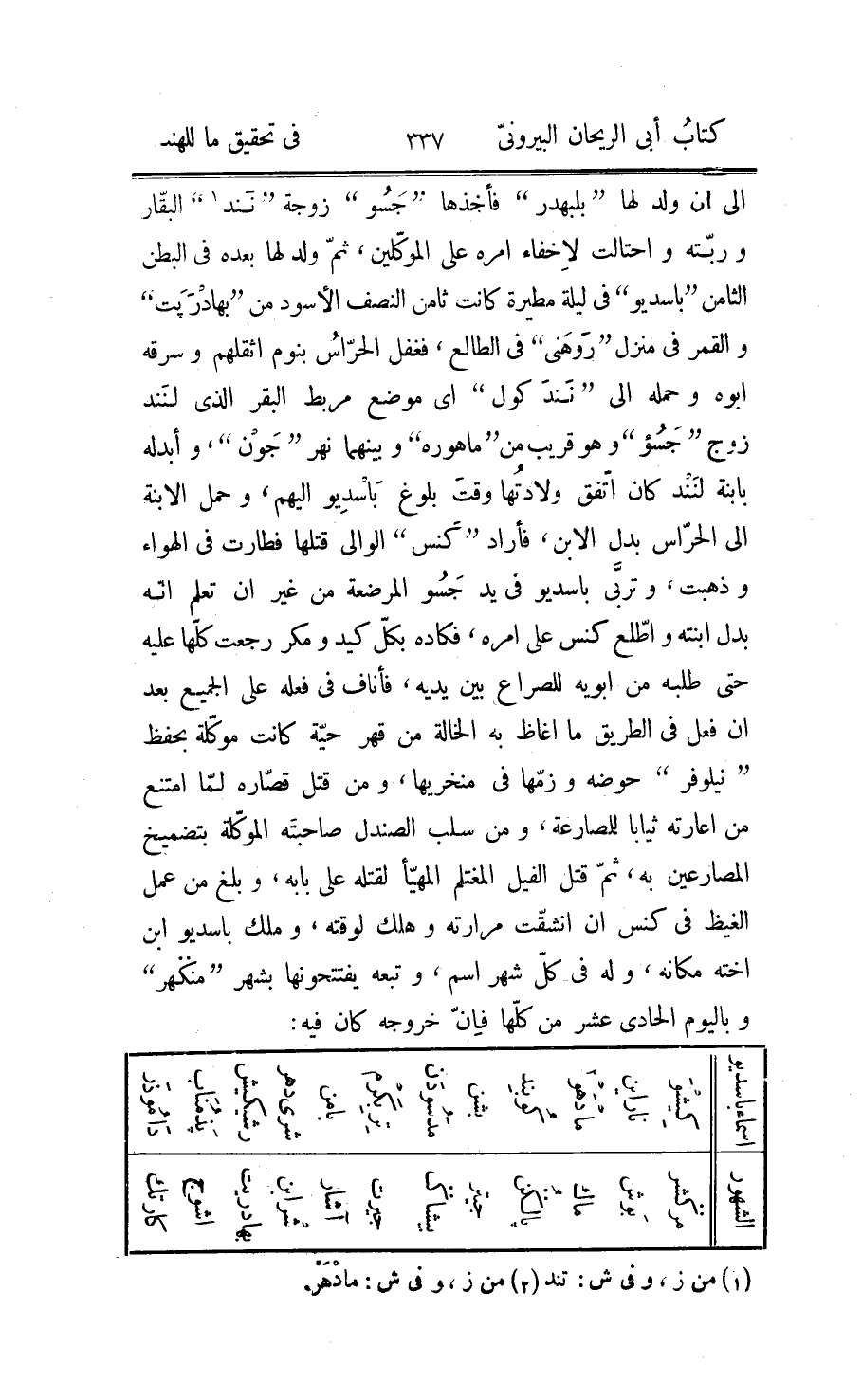 الوقت الذي تريد وأجزائها، والخطأ في هذا ممّا يقف عليه الناسخ كتابة فكيف الحاسب الذي يحسبه اذا ضرب في أدماسه الجزئيّة بدل الكلّيّة؛ وفي كتابه عمل آخر للتحليل حسن وهو أنّ شهور السنين إذا حصلت ضربت في شهور القمر وقسم المبلغ على شهور الشمس، فيخرج شهور أدماسه مضافة الى شهور السنين، وإذا ضربت في ثلاثين وزيد على ما مضى من أيّام الشهور المنكسر، اجتمعت الأيّام القمريّة، وإن قدّم ضرب الشهور الأوّلة في ثلاثين وزيد عليها ما مضى من الشهر حتى يجتمع الأيّام الشمسيّة الجزئيّة ثمّ فعل بها ما تقدّم خرجت أيّام أدماسه مضافة الى الأيّام الشمسيّة؛ وعلّة هذا أنّا إذا ضربنا كما تقدّم في شهور أدماسه الكلّيّة وقسمنا على شهور الشمس الكلّيّة فخرج حصّة ما ضربناه من أدماسه، ومعلوم أنّ شهور القمر هي مجموع شهور الشمس مع شهور أدماسه فإذا ضربنا فيها والقسمة بحالها، كان الخارج أيضا هو مجموع المضروب مع المطلوب وذلك هو الأيّام القمريّة، وقد تقدّم أنّها إذا ضربت في أيّام النقصان الكلّيّ وقسم المبلغ على الأيّام القمريّة الكلّيّة أنّه تخرج حصّتها من أيّام النقصان، لكنّ الأيّام الطلوعيّة في «كلب» تنقص عن القمريّة بأيّام النقصان، فنسبة ما معنا من الأيّام القمريّة اليها منقوصا منها حصّتها من النقصان كنسبة كلّ الأيّام القمريّة إليها منقوصا منها كلّ النقصان وذلك هو الأيّام الطلوعيّة الكلّيّة، فإذا ضربنا ما معنا في الأيّام الطلوعيّة الكلّيّة وقسمنا المجتمع على الأيّام القمريّة الكلّيّة خرج أيّام التأريخ المعطى طلوعيّة وهو المطلوب، وينوب عن كلّ الأيّام الطلوعيّة في الضرب 3506481 وعن كلّ الأيّام القمريّة في القسمة 3562220؛ وللهند في هذا الباب عمل آخر وهو أنّهم يضربون ما مضى من سنى «كلب» في اثنى عشر ويزيدون على المبلغ ما مضى من السنة من الشهور التامّة، ويضعون المبلغ على 69120 وما خرج ينقصونه من الأوسط، ويقسمون ضعف الباقي منه على 65، فيخرج شهور «أدماسه» الجزئيّة، ويزيدونها على الأعلى، ثمّ يضربون الجملة في ثلاثين ويزيدون عليها ما مضى من الشهر، فيجتمع الأيّام الشمسيّة الجزئيّة، ويضعونها