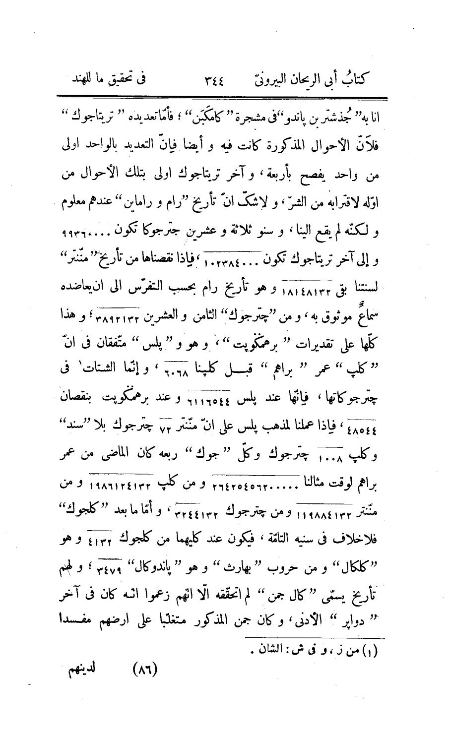 710261327520 وهي الأيّام الشمسيّة الجزئيّة قسمناها على ثلاثين، فخرج 23675377584 وهي شهور شمسيّة رفعناها بالاثنى عشر، فارتفع 1972948132 وهي السنون الهنديّة قد عادت كما كانت أوّلا في المثال؛ ولذلك أيضا وجه ذكره يعقوب وهو أن يضرب الأيّام الطلوعيّة المعطاة في أيّام القمر الكلّية ويقسم المبلغ على الأيّام الطلوعيّة الكلّيّة، ويوضع ما يخرج في موضعين، ويضرب أحدهما في شهور ادماسه الكلّيّة ويقسم ما يجتمع على أيّام القمر الكلّية، فيخرج شهور ادماسه، وينقص مضروبها في ثلاثين من الموضع الآخر، فيحصل فيه الأيّام الشمسيّة الجزئيّة، فترفع الى الشهور والسنين، وذلك لأنّا قلنا قبل أنّ الأيّام المعطاة هي فضل ما بين قمريّتها ونقصانها كما أنّ الأيّام الطلوعية الكلّيّة هي فضل ما بين قمريّتها ونقصانها الكلّيّين، فهي متناسبة، ولذلك يخرج الأيّام القمريّة الجزئيّة التي نضعها في موضعين، وإذ هي مساوية لمجموع شمسيّتها وأيّام ادماستها كما أنّ أيّام القمر الكلّية مساوية لمجموع أيّام الشمس وأيّام ادماسه الكلّيين، فإنّ ادماسه الجزئيّة والكلّيّة على نسبتهما سواءا كانتا معا شهورا أو كانتا أيّاما؛ وأمّا ما ذكر يعقوب من استخراج أيّام النقصان الجزئيّ من قبل شهور ادماسه الجزئيّة وهو في جميع النّسخ: بضرب ما مضى من ادماسات وأجزاء المنكسرة في أيّام النّقصان الكلّيّ ويقسم المجتمع على شهور الشمس الكلّيّة، فما خرج يزيده على ادماسه، ويكون ذلك عدد ما مضى من النقصان، فأظنّه مجرّدا لا عن معرفة ولا استبثاق منه باستقراء وتجربة، فإنّ شهور «ادماسه» في الماضي من «جترجوك «1» » على رأي «بلس» الى وقت مثالنا 1196525 و 1337 من 1500، فإذا ضربناها في نقصان جترجوك «1» اجتمع