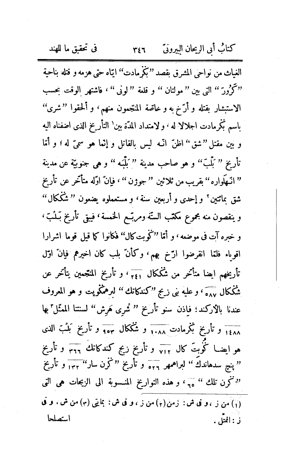 التواريخ التي تحلّ الى الأيّام في الزيجات ربّما لم يتّفق اوائلها من الأوقات التي فيها يكمل ادماسه وأيّام النقصان، فيحتاج اصحابها الى اعداد مفروضة في عملها تزاد او تنقص حتى يلحق العمل بنظامه، ونحن نذكر ما وقفنا عليه من ذلك فيما اتّفق مطالعته من زيجاتهم، ونقدّم اوّلا ما في زيج «كندكاتك» لأنّ هذا الزيج اكثر اشتهارا ومنجّميهم «1» له اشدّ ايثارا؛ قال «برهمكوبت» : ضع «شككال» وانقص منه 587 واضرب الباقي في اثني عشر وزد عليه ما مضى من السنة من الشهور التامّة، واضرب الجملة في ثلاثين وزد عليه ما مضى من الشهر من الأيّام، فيجتمع الأيّام الشمسيّة الجزئيّة فضعها في ثلاثة امكنة، وزد على كلّ واحد من الأوسط والأسفل خمسة واقسم اسفلها على 14945، فما خرج فانقصه من الأوسط والغ ما يبقى في القسمة، ثمّ اقسم الأوسط على 976، فما خرج فشهور «ادماسه» التامّة وما بقي فهو الماضي من ادماسه المنكسرة، واضرب تلك الشهور في ثلاثين وزد ما بلغ على المكان الأعلى، فيجتمع الأيّام القمريّة الجزئيّة فاتركها في الأعلى وأنزل مثلها الى الموضع الأوسط واضربه في احد عشر وزد عليه 497، وما اجتمع فضعه ايضا في الأسفل، ثمّ اقسم ما بلغ على 111573؛ فما