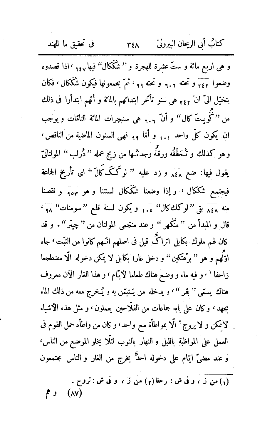 فاسد وهو: إذا اردت ان تعلم الأركند يعني «اهركن» فخذ تسعين واضربها في ستّة وزد عليها ثمانية وسني ملك السند وهي الى صفر سنة سبع عشرة ومائة وهو جيتر مائة وتسع سنين، وألق منها 587 فيبقى سنو «الشخ» ، وأيسر من ذلك: ان تأخذ سني يزدجرد التامّة فتلقي منها 33 ابدا، فيبقى سنو الشخ، او تأخذ اصل سني الأركند التسعين، فتضربها في ستّة وتزيد عليها اربعة عشر، ثمّ تزيد عليها سني يزدجرد وتلقي منه 587، فيبقى سنو الشخ، وما اظنّ هذا الشخ الّا «شق» ، ولكنّ ما يحصل من التأريخ ليس بتأريخه وإنّما هو تأريخ «كوبت كال» الذي يحلّ ايّاما، ولو كان يضع هذه التسعين مضروبة في ستّة مزيدا عليها ثمانية وذلك 548 غير متغيّر بازدياد السنين لكان الأمر سواء وبعد عن التكلّف، وصفر الذي اشار اليه موافق الأوّل ليوم الثامن من «ديماه» سنة 103 ليزدجرد، ولهذا علّق امر «جيتر» بالهلال الواقع في ديماه، لكنّ شهور الفرس تقدّمت منذ ذاك بسبب اهمال «1» ربع اليوم فيها، ويقتضي الموضوع تقدّم تأريخ ملك السند الذي ذكر تأريخ «يزدجرد، بسبع سنين، فيكون سنوه لوقت مثالنا 405، ومع سني الأركند التي هي اصله اعني 548 تكون 953 وهو «شككال» ، وبالنقصان الذي امر به منه يصير «كوبت كال» ، وما بقي من العمل في التحليل فهو على ما حكيناه عن «كندكاتك» ، وربّما وجد في بعض نسخه قسمة على الف بدل القسمة على 976 وذلك غلط في النسخ لا انّه وجه؛ ونتبع هذا بعمل «بجيانند» في زيجه المعروف بكرن تلك وهو هذا: