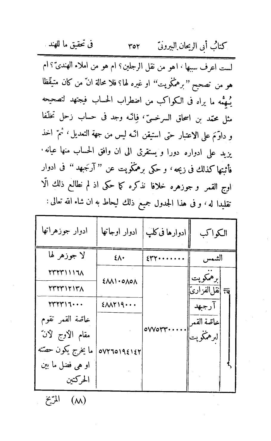 ثلاثين، ووضعها مع الأيّام الماضية من الشهر في مكانين، وضرب الأسفل في احد عشر وزاد عليه 686، ووضع المبلغ اسفل منه، وقسمه على 403963 وزاد ما يخرج على الأوسط، وقسم المجتمع على 703، فخرج ايّام النقصان، ونقصها من الأعلى، فبقي «اهركن» الطلوعيّ؛ وقد تقدّم هذا العمل كليّا، ولمّا فرضه الرجل لوقت زاد فيه الزيادات والباقي على حاله؛ وأما ما في «كرن سار» فقد منع عن ايراد ما فيه عدول صاحبه عن التحليل الى طريق آخر، وفساد الترجمة فيما حصل منه، والذي يمكن حكايته هو أنّه نقص من «شككال» 821، فبقي الأصل، وهو لمثالنا 132، وضعه في ثلاثة مواضع، وضرب الأوّل في 132 درجة، فاجتمع لمثالنا 17464 «1» ، وضرب الثاني في 46 دقيقة فاجتمع 6072، وأمّا الثالث فضربه في 34 فصار 4488 وقسمه على 50 فخرج دقائق وما اراد ان يتلوها وذلك فط مو، ثمّ زاد على الدرج المجتمعة في الأعلى 112 «2» ورفع ما ارتفع من المجتمعات الى ما فوقها والدرج الى الأدوار، فحصل بعد ثمانية وأربعين دورا شكح ما مو، وذلك وسط القمر لوقت دخول شمس الحمل، فقسم درج وسط القمر على اثني عشر، فخرج ايّام، وضرب الباقي في ستّين وزاد عليه بدقائق الوسط القمر، وقسم الجملة على اثني عشر فخرج «كهري» وعلى هذا القياس ما بعدها، وكان ما خرج لنا كز كج كط وذلك ايّام «ادماسه» ولا شك انّها الماضي من ادماسه التي نحن فيه في توليد مقدارها انّه قسم اعداد القمر التي ذكرنا وهي قلب مولد على اثني عشر فخرجت حصّة السنة يا ج نب ن وحصّة الشهر منها. نه يط كدى، واستخرج مدّة اجتماع ثلاثين يوما من هذه الحصّة فكانت سنتين «3» وثمانية اشهر وستّة عشر يوما وأربعة «كهري» وخمسا «4» وأربعين «جشه»