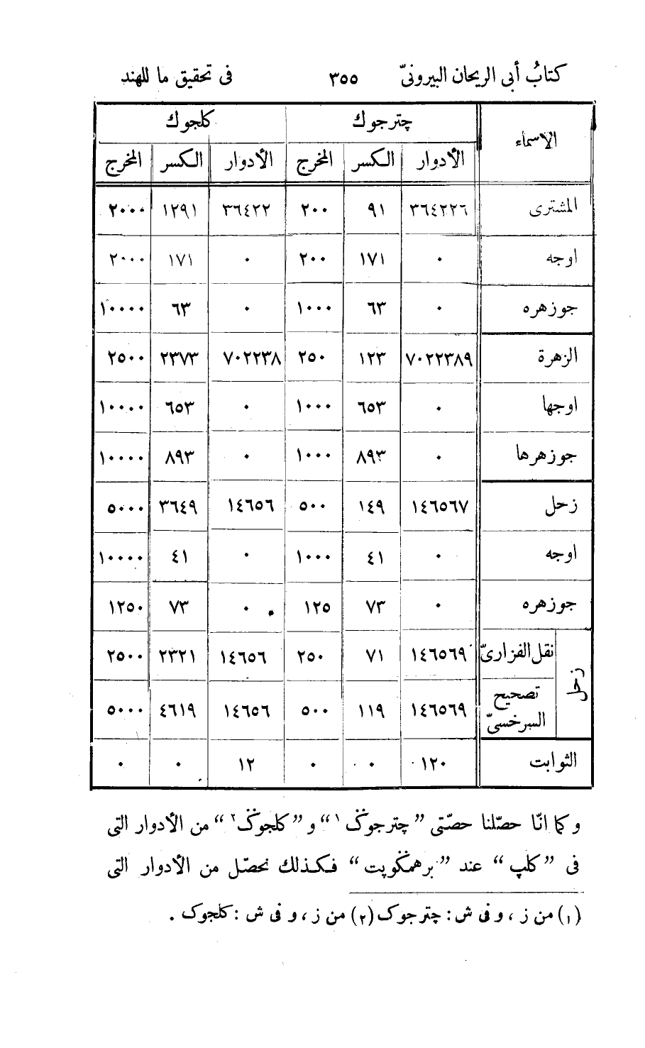 المبالغ على هذا العدد الأخير، فخرج ثوان «1» وما بعدها الى حيث اراد، وذلك هو الوسط المطلوب، وهذا لأنّه احتاج في البقيّة من الأدوار الى ضربها في اثني «2» عشر وقسمه المجتمع على أيّام «جترجوك» «3» لأن عمله عليه فقسم بدل «4» ذلك على مقسوم ايام جترجوك «4» على اثني عشر، وهو العدد الأوّل من الأعداد الثلاثة، واحتاج في بقيّة البروج الى ضربها في ثلاثين وقسمة المبلغ على ما قسم عليه فقسم بدل ذلك على مقسوم العدد الأوّل على ثلاثين، وهو العدد الثاني، وعلى هذا القياس اراد ان يقسم بقيّة الدرج على مقسوم العدد الثاني على ستّين، لكنّه لمّا قسمه عليه خرج 73051 وبقي ثلاثة ارباع، فضرب الجملة في اربعة لينجبر المكسّر، ولهذا استعمل ايضا اربعة اضعاف البقيّة فلمّا لم ينفذ له الأعداد على ما أشير اوّلا عاد الى الضرب في ستّين؛ وان اردنا سلوك هذه الطريقة في «كلب» على مذهب «برهمكوبت» كان العدد الأوّل الذي يقسم عليه بقيّة الأدوار 131493037500، والثاني الذي يقسم عليه بقيّة البروج 4383101250، والثالث يكون 37051687 «5» ، ويبقى نصف يحوج الى التضعيف، حتى يصير 146103375 ويقسم عليه ضعف البقيّة؛ وقد عدل «برهمكوبت» عن «كلب» و «جترجوك» «6» بكثرة ايّامها الى «كلجوك» تخفيفا، فمتى عمل بتأريخه ما تقدّم من التحليل على مذهبه وضربت ايّامه في ادوار الكوكب في كلب، وزيد عليه اصله وهو بقيّة الأدوار التي كانت له في اوّل كلجوك «7» وقسم المبلغ على ايّام كلجوك «7» الطلوعيّة وهي 157791645، خرجت ادواره التامّة الملغاة، ثمّ عمل