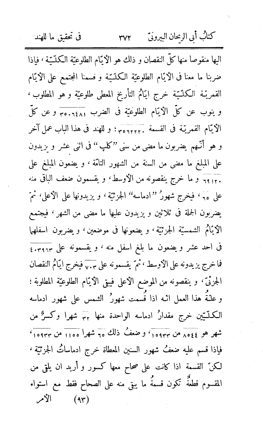 وأمّا في زيجاتهم فمعرفة مقدار قطري النيّرين في «كندكاتك» وفي «كرن سار» هو العمل الذي في زيج الخوارزميّ، وقطر الظلّ أيضا في كندكاتك مثل الذي فيه وأمّا في كرن سار فإنّه ضرب «بهت» القمر في أربعة وضرب بهت الشمس في ثلاثة عشر، وقسم فضل ما بين المجتمعين على ثلاثين فخرج قطر الظلّ، وأمّا في «كرن تلك» فإنّه في قطر الشمس أمر بتنصيف «بهت» الشمس ووضع النصف في مكانين، وقسمة أحدهما على عشرة وزيادة ما يخرج على المكان الآخر،