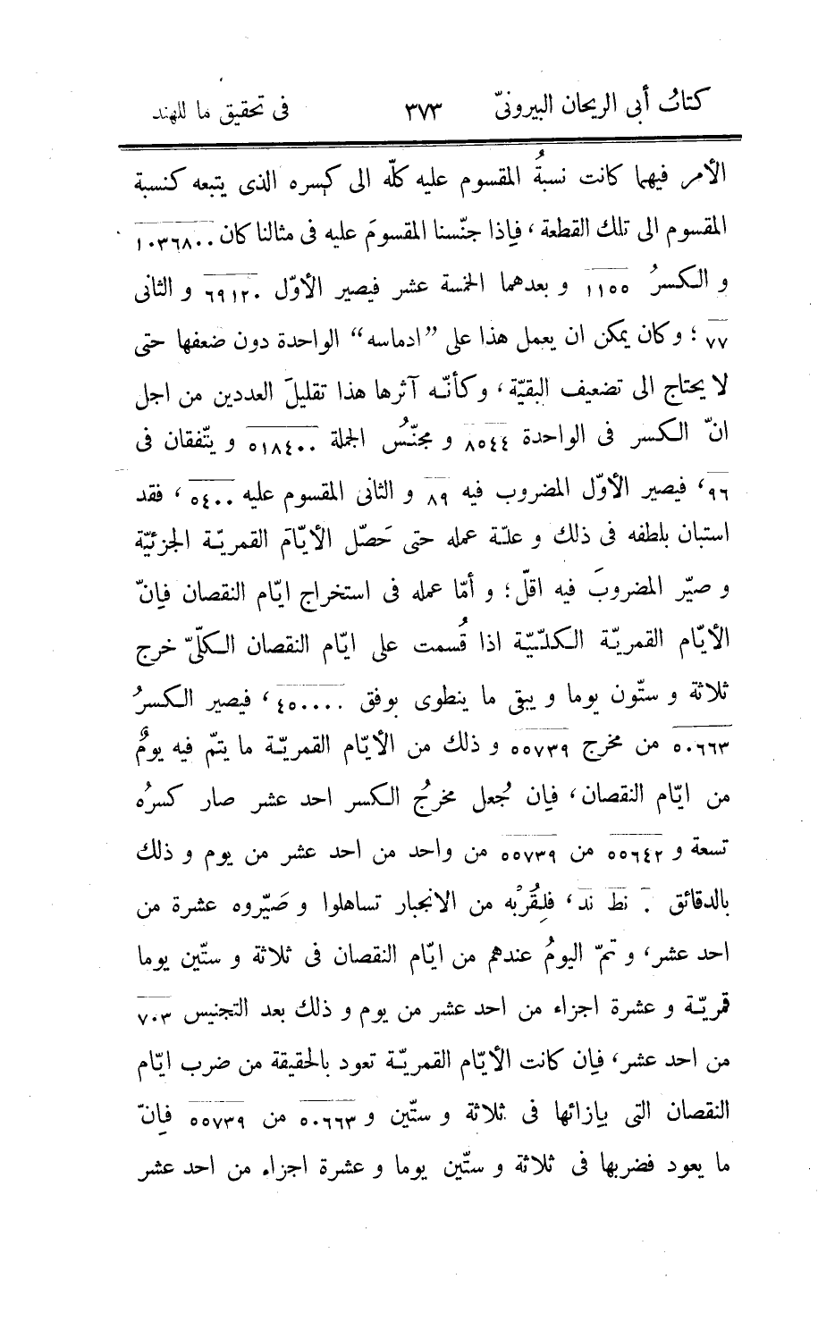فيكون دقائق قطر الشمس، وأمّا في القمر فإنّه وضع بهته وزاد عليه جزءا من ثمانين منه وقسم المبلغ على خمسة وعشرين، فخرج دقائق قطره، وأمّا في الظلّ فإنّه ضرب بهت الشمس في ثلاثة ونقص من المبلغ جزءه من أربعة وعشرين، ونقص من المبلغ جزءه من أربعة وعشرين، ونقص الباقي من بهت القمر وقسم ضعف الباقي على خمسة عشر، فخرج دقائق الجوزهر، ولو ذهبنا نورد ما في زيجاتهم لخرجنا به عمّا نحن فيه، وإنّما نورد منها فيما يتّصل بما نحن فيه ما يستغرب أو لا يكون موجودا عند أصحابنا وفي ديارنا.