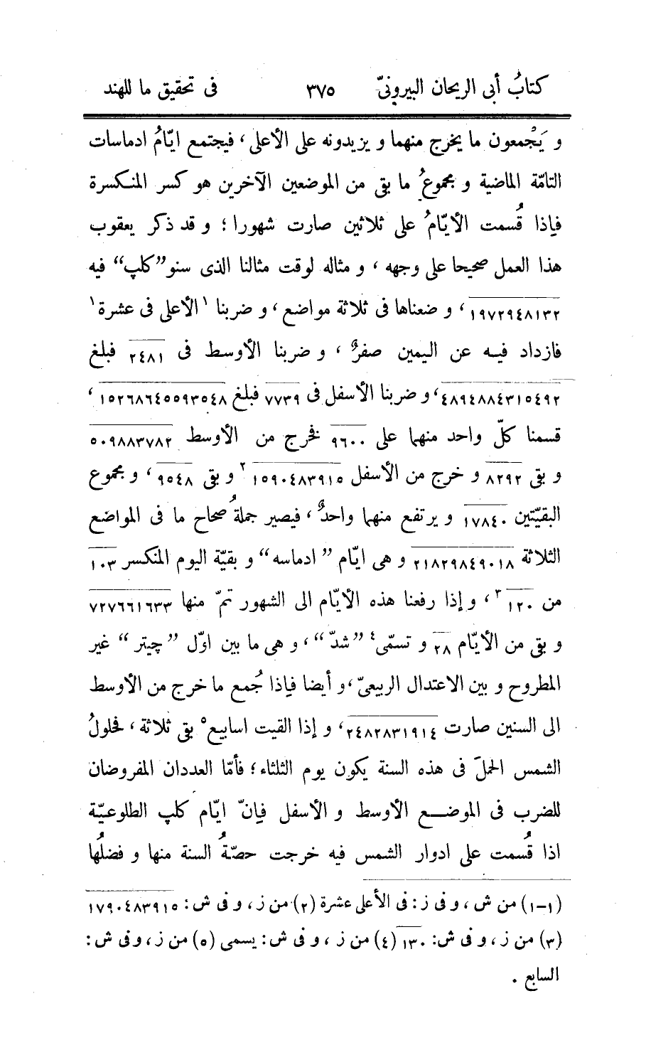 طرائق القمر ولا يستعملون من الثوابت الّا ما يقارنه القمر او يقاربه، والهند لا يلتزمون هذه الشريطة ولكنّهم يعتبرون فيها المحاذاة والمسامتة، ثمّ يدخلون النسر الواقع في الجملة فيصير العدد به ثمانية وعشرين، ولهذا أوهم منجّمونا ومؤلّفو كتب الأنواء في هذا المعنى وذكروا انّ المنازل عند الهند ثمانية وعشرون وأنّهم اسقطوا واحدا هو المستتر دائما بشعاع الشمس، كأنّهم سمعوا الهند يسمّون المنزل الذي فيه الشمس «محترقا» والذي فارقته «مفترقا بعد العناق» والذي امامها «متدخّنة» ، ومن اصحابنا من نصّ على سقوط الزباني ثمّ علّله بأمر الطريقة المحترقة في آخر الميزان، وأوّل العقرب، كلّ ذلك منهم ظنّ بأنّ المنازل عند الهند ثمانية وعشرون ثمّ يلحقها الإسقاط، وليس كذلك فإنها سبعة وعشرون ثمّ يلحقها الازدياد، وقد حكى «برهمكوبت» انّ في كتاب «البيذ» ممّن يسكن جبل «ميرو» انّه يرى شمسين وقمرين والمنازل اربعة وخمسين ويتضاعف عليه الأيّام ايضا، ثمّ اخذ في مناقضته بأنّا لا نرى سمكة القطب دائرة في اليوم مرّتين بل مرّة واحدة، وأمّا انا فاعيتني الحيل في توجيه وجه لهذه القضية الكاذبة؛ فأمّا معرفة موضع كوكب او درجة مفروضة من المنازل فهو: ان يجعل بعده من اوّل الحمل كلّه دقائق وتقسم على ثمان مائة، فيخرج منازل تامّة سابقة للذي هو فيه، ويبقى ما قطع من المنزل المنكسر، فإمّا ان تنسب الى الثمان مائة كما هما وإمّا مطويّين «1» بالوفق وإمّا ان ترفع الدقائق الى الدرج وإمّا ان تضرب في ستّين ويقسم المجتمع على ثمان مائة فيخرج ما قطع منه على انّ المنزل واحد مقسوم بستّين، وهذه كلّها تعمّ القمر والكواكب وغيرها، ثمّ تخصّ القمر بأن يقسم مضروب البقيّة في ستّين على بهته فيخرج ما مضى من اليوم المنازليّ؛ والهند في امر الكواكب الثابتة قليلو المحصول ولم اظفر منهم بمن يعرف كواكب المنازل عيانا ويشير اليها بنانا، وإنّما اجتهدت غاية الاجتهاد في تحصيل اكثر ذلك بالقياسات