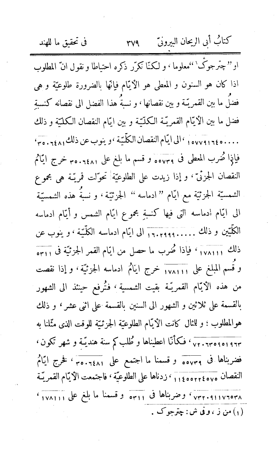 ابتداؤها من «جيرت» وانتهاؤها الى «اوترابتربت» يتأخّر العيان عن الحساب فلا يحلّ القمر احدها بالعيان الّا مع خروجه منه الى الذي يليه بالحساب؛ فمصداق ما وصفتهم به غير ظاهر عليهم قوله مثلا في الشرطين وهو من جملة الستّة المنازل انّ العيان يسبق فيه الحساب وكوكباه في زماننا في ثلثي الحمل وزمان براهمهر يتقدّمنا بقريب من خمس مائة وستّ وعشرين سنة، وبأيّ رأي عمل في حركة الثوابت فإنّهما لا يتقدّمان ثلث الحمل، فهب انّهما فيه في زمانه او بالقرب منه على ما في «كندكاتك» وحساب النيّرين فيه صحيح لم يستبن فيه بعد ما استبان في زماننا من تخلّفه ثماني «1» درج، فكيف يسبق العيان فيه الحساب والقمر اذا قارنهما كان قد قطع من المنزل الأول قريبا من ثلثيه؟ وعلى هذا القياس سائرها؛ وإنّما تتسع المنازل وتتضايق من جهة سماتها اعني الكواكب دون ذواتها فإنّها متساوية، وليس يعرف ذلك من شأن الهند معما حكينا عنهم في بنات نعش، وقال «برهمكوبت» في «اوتر كندكاتك» اي تصحيحه: انّ من المنازل ما يفضل مقداره على مقدار وسط القمر ليوم بنصفه، فيكون المنزل يط مه نب يح، وهي ستّة منازل اسماؤها روهني، بونربس، اوترابلكني، بشاك، اوتراشار، اوترابتربت» وجملتها قيح له يج مح، ومنها ستّة قصار كلّ واحد منها يقصر عن وسط القمر ليوم بنصفه، فيكون المنزل وله يزكو، وأسماؤها «بهرني» آردر، اشليش، سوات، جيرت، شدبش «2» » ، وجملتها لط لا مد لو، والخمسة عشر «3» الباقية يساوي «4» كلّ واحد منها وسط القمر ليوم، فيكون المنزل يج ى لد نب، وجملتها قصر «5» لح مج، وجملة الجمل الثلاث شنه مه ما كد ويبقى الى تمام الدور د يد يح لو وهو حصّة