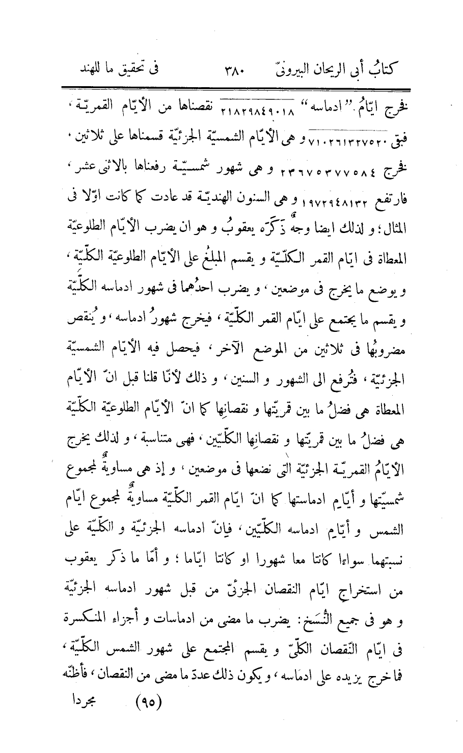 «ابهج» المتروك اعني النسر الواقع، وقد انعمت الفحص عن ذلك في المقالة المذكورة؛ وأمّا قلّة هداية الهند لحركة الثوابت فيكفي شاهدا عليه قول «براهمهر» في «سنكهت» : انّه ذكر في كتب الأوائل انّ المنقلب الصيفي في نصف اشليش والشتوي في اوّل «دهنشت» ، وكان ذلك حينئذ صحيحا، فأمّا الآن فالصيفي من المنقلبين في اوّل السرطان والشتويّ في اول الجدي، فإن تشكّك في ذلك احد وزعم انّه كما ذكر الأوائل دون ما ذكرناه فليصحر الى مكان مستوحين يتفرّس اقتراب المنقلب الصيفيّ، وليدر فيه دائرة وينصب على مركزها شخصا يقوم عمودا على الأفق، ويعلم على رأس ظلّه حتى يوافي محيط الدائرة في احد جانبي المشرق والمغرب، ويعود كالغد حول مثل ذلك الوقت الأمسيّ ويرصد مثل ما رصد اوّلا فإن وجد رأس الظلّ في الخيط زائلا عن العلامة الأولى نحو الجنوب فليعلم انّ الشمس قد تحرّكت نحو الشمال ولم ينقلب بعد، وإن وجده زائلا نحو الشمال علم انّ الشمس قد تحرّكت نحو الجنوب وانقلبت، وإذا رصد ذلك دائما ووقف على يوم الانقلاب تحقّق ما ذكرناه؛ وهذا دليل من «براهمهر» على انه لم يعرف انّ للكواكب الثابتة حركة نحو المشرق، فجعلها كاسمها وحرّك المنقلب نحو المغرب، وبسبب هذا التخيّل خلّط الأمرين في المنازل فلنميّز بينهما لتزول الشبهة ويتهذّب الكلام، وذلك انّ البروج اذا ابتدئ فيها من نصف سدس المنطقة الذي من التقاطع نحو الشمال على توالي الحركة الثانية، فإنّ المنقلب الصيفي يكون ابدا على رأس البرج الرابع، والشتويّ على رأس البرج العاشر، وفي المنازل اذا ابتدئ بثلث تسع المنطقة الذي من اوّل البرج الأوّل، كان المنقلب الصيفيّ على ثلاثة ارباع المنزل السابع ابدا والشتوي على ربع المنزل الحادي والعشرين، لا يتغيّر ذلك طول مدّة العالم، فأمّا اذا وسمت المنازل بكواكب وسمّيت بأسماء تابعة للكواكب فلا بدّ من انتقالها معها، وكواكب البروج والمنازل كانت في الأقسام التي قبلها في سوالف الأزمنة، ثم انتقلت الى هذه