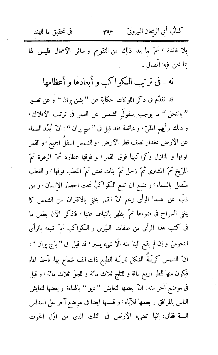 أمّا أنّ كاسف القمر هو ظلّ الأرض وكاسف الشمس هو القمر، فقد تحقّقه منجّموهم وعليه بنوا في الزيجات وغيرها حساباتهم، وقال «براهمهر» في كتاب «سنكهت» : أنّ بعض العلماء زعم أنّ الرأس كان من جملة «ديت» وأمّه «سنكهك» ، وأنّ الملائكة لمّا استخرجوا الهناءة من البحر سألوا «بشن» توزيعها بينهم، ففعل وجاء الرأس متشبّها بالملائكة في الصورة وداخلهم، ولمّا ناوله بشن بالقسم من الهناءة تناوله وشربه، وعرف بشن أمره فضربه بالجكر المستدير وحزّ رأسه، فبقي الرأس حيّا بسبب الهناءة التي في الفم ومات البدن اذ لم يكن بلغته ولا انتشرت «1» فيه قوّتها «1» ، فتضرّع الرأس قائلا بأيّ ذنب فعل بي هذا؟ فعوّض بالرفع الى السماء وتصييره من جملة أهلها، وقال بعضهم أنّ للرأس جرما كما للنيّرين إلّا أنّه أسود مظلم فلذلك لا يرى في السماء، وقد أمره «براهم» الأب الأوّل ان لا يظهر في السماء أصلا إلّا في وقت الكسوف، وقال بعض أنّ له رأسا كرأس الحيّة وذنبا كذنبها، وقال آخرون أنّه لا جرم له سوى هذا السواد الذي يرى؛ ولمّا فرغ «براهمهر» عن حكايات الخرافات قال: لو كان للرأس جرم لكان فعله بالمماسّة وقد نجده يكسف بالبعد اذا كان بينه وبين القمر ستّة بروج، وليس