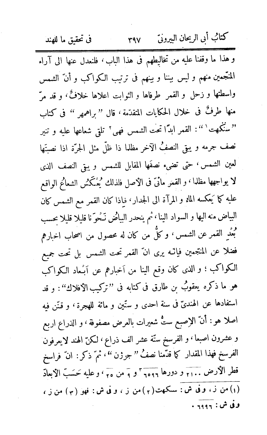 يجب صفحهم «1» ان لم يجب خلافهم أنّهم كانوا يستدلّون على كون الكسوف بصبّ مقدار يسير من الماء مع مثله من الدهن في آنية واسعة مسطوحة الأسفل فى اليوم الثامن من الأيّام القمريّة، وتأمّل مواضع اجتماع الدهن وتفرّقه، فكانوا ينسبون أوّل الكسوف الى المجتمع وآخره الى موضع التفرّق، وحكى عن بعض أنّه كان يظنّ بسبب الكسوف أنّه اجتماع الكواكب المتحيّرة وأنّ بعضهم كان يستدلّ على كونه من كوائن المناحس التي هي الانقضاض والشهب والهالة والظلمة والعصوف والهدّة والزلزلة، قال وهذه الأشياء لا تكون دائما مع الكسوف ولا هي سبب كونه وإنّما تشاركه في طباع المنحسة، وطريقة العقل بمعزل عن هذه الخرافات؛ والرجل مع تحصيله على طباع قومه في خلط الماش بالدرماش والدرّ بالبعر فإنّه قال غير حاك «2» عن أحد: ان هبت ريح شديدة وقت الكسوف كان الكسوف الذي يتلوه بعده بستّة أشهر، وإن انقضّ كوكب كان الكسوف التالي له بعد اثنى «3» عشر شهرا، وإن اغبرّ الجوّ فبعده بثمانية عشر شهرا، وإن زلزلت الأرض فبعد أربعة وعشرين شهرا، وإن أظلم الهواء فبعده بثلاثين شهرا، وإن سقط برد فبعد ستّة وثلاثين شهرا، وأرى السكوت عن هذا جوابا، ولكنّي أقول أنّ ما في زيج الخوارزميّ من ألوان الكسوف وإن انتظم في الكلام فهو مخالف للعيان والذي عليه الهند منه أصحّ وأصوب وهو أنّ الكسوف القاصر عن نصف جرم القمر يكون دخانيّ اللون فإذا استتمّ نصفا حلك لونه وإذا زاد على النصف خالط حلوكته حمرة حتى إذا تمّ كان بعد ذلك أصفر فيه شقرة.