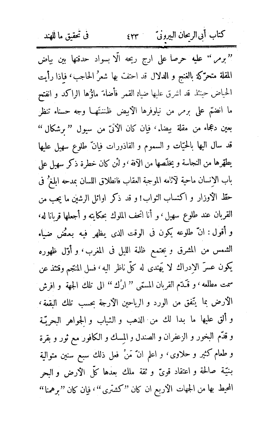 سائر الاختلافات في كثرة النعم وقلّتها وتواتر الآفات وعدمها ممّا يدعو المتمدّنين الى اختيار الأمكنة لبناء المدن من أجلها، وهذا بسبب الرسوم الجارية، لكنّ الأوامر الشرعيّة أقوى منها وأغلب على الطباع من الرسوم والعادات، ألا ترى أنّ علل هذه مطلوبة وهي بحسبها مأخوذة أو مرفوضة وعلل تلك متروكة غير مطلوبة يتمسّك بها الأكثرون تقليدا، ولا يحتجّون فيه بأكثر ممّا يحتجّ به ساكن البقعة النكدة اذا ولد بها ولم يشاهد غيرها من حبّ الوطن وصعوبة النقلة عن المسكن، ثمّ اذا كان تفاضل البقاع من جهة أمر ملّيّ فقد حصل عند العاملين به ما لا ينقلع عن افئدتهم الى الأبد؛ وللهند مواضع تعظّم من جهة الديانة مثل بلد «بارانسي» ، فإنّ زهّادهم يقصدونه ويلزمونه لزوم مجاوري الكعبة مكّة، ويحرصون على أن تأتيهم «1» فيه آجالهم لتكون عقباهم بعد الموت خيرا، ويقولون أنّ سافك الدم مأخوذ بذنبه مكافي على حوبه الّا أن يدخل بلد بارانسي فينال فيه العفو والغفران، ويزعمون في سببه: أنّ «براهم» كان ذا أربعة أرؤس في الصورة، وأنّه وقع بينه وبين «شنكر» وهو «مهاديو» شرّ تأدّت المنازعة بينهما فيه الى اقتلاع أحد تلك الأرؤس منه، وكانت العادة وقتئذ أن يتّخذ رأس المقتول بيد القاتل ويبقى معلّقا منها للخزي والعلامة، وكذلك التحم «2» فخفّ رأس براهم بيد مهاديو وكان يطوف به في مقاصده ومتصرّفاته، لا يزايله فيما دخل من البلاد الى أن بلغ بارانسي، وسقط الرأس من يده لمّا دخله وبان عنها؛ ومن أمثال تلك البلاد «بوكر» ، وسببه: أنّ براهم كان يقيم فيه للنار قربانا فخرج منها خنزير، ولذلك جعلوا صنمه على صورة خنزير، وعمل خارج البلد في ثلاثة مواضع منه حياض مبجّلة هي متعبّدات، ومنها «تانيشر» ويسمّى «كركيتر» أي أرض «كر» وكان رجلا فلّاحا زاهدا صالحا، يعمل العجائب بالقوّة الإلهيّة، فنسبت الأرض