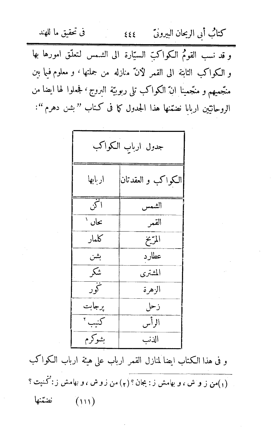 من الشهر فهو صوم يسمّى «آتج» ، وأعمال البرّ فيه تمكّن من نيل الإرادات كما تمكّن منها «سكر» و «كاكست» و «دندهمار» ونالوا الملك لمّا فعلوه، واليوم السادس من «جيتر» صوم باسم الشمس، وفي «آشار» اذا كان القمر في منزل «انّراد» وهو السابع عشر من المنازل فهو صوم لباسديو يسمّى «ديوسيني» أي أنّ «ديو» نائم لأنّه أوّل الأربعة الأشهر التي نامها، ومنهم من يزيد في الشريطة كون اليوم حادي عشر الشهر، ومعلوم أنّ ذلك لا يتّفق كلّ سنة، ومن كان من شيعة «باسديو» اجتنب فيها اللحم والسمك والحلوى واقتراب النساء وجعل أكله مرّة كلّ يوم، وجعل الأرض وطاءه من غير فرش ولا ارتفاع عنها بسرير، وقد قيل في هذه الأربعة الأشهر أنّها ليل الملائكة مستثنى من أوّله شهر للشفق ومن آخره شهر للفجر، ولكنّ الشمس تكون حينئذ قريبة من أوّل السرطان وهو نصف نهار الملائكة فلا أدري كيف يتّصل بسنديه «1» ، ويوم الاستقبال من «شرابن» صوم باسم «سومنات» ، وفي «اشوجج» اذا كان القمر في السرطان والشمس في السنبلة فهو صوم، واليوم الثامن من هذا الشهر صوم لبهكبت، وفطره مع طلوع القمر، واليوم الخامس من «بهادرو» صوم اسم الشمس يسمّى «شتّ» ، يطلون فيه على شعاعها والوالج من الكواء أنواع الطيب ويضعون عليه الرياحين والأنوار، وفي هذا الشهر إذا كان القمر في منزل «روهني» فهو صوم ولادة باسديو، ومنهم من يزيد في الشريطة كون اليوم ثامن النصف الأسود، وقد قلنا أنّ ذلك لا يدوم بالتوالي بل يتّفق، وفي «كارتك» اذا كان القمر في «ريوتي» آخر المنازل فهو صوم انتباه باسديو من رقاده ويسمّى «ديوتّيني» أي قيام ديو، ومنهم من يزيد في شرطه كونه حادي عشر من النصف الأبيض، وفيه يتلوّثون بأخثاء البقر ويفطرون بلبنها وبولها وأخثائها مقطوبة، وهذا اليوم أوّل أيّام خمسة يسمّونها «بيشم «2» بنج