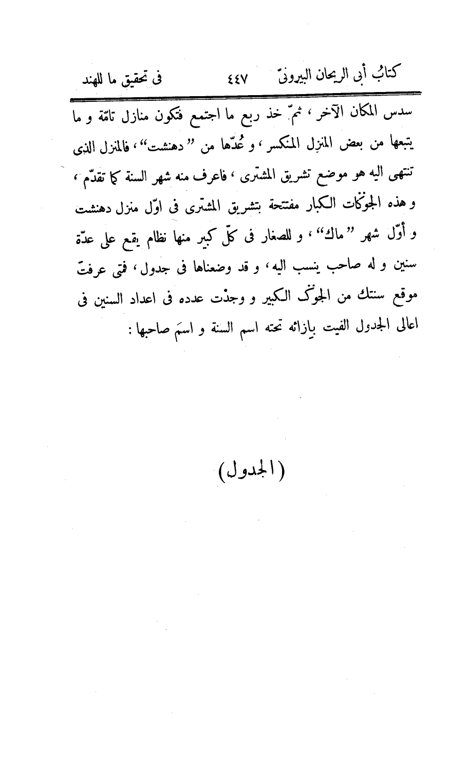 عنده ويقرّبن الطيب ولا يأكلن شيئا ويتلاعبن بالأرجوحة، ثمّ يتصدّقن في غده ويأكلن، وفي العاشر من «بيشاك» يبرز من البراهمة من استحضره ملوكهم الى الصحارى ويوقدون النيران العظيمة للقرابين خمسة أيّام الى الاستقبال، ويكون ايقادهم إيّاها في ستّة عشر موضعا كلّ أربعة منها على حدة، يتولّى القربان فيها «برهمن» ليكونوا أربعة بعدد «بيذ» ، ثمّ يرجعون في اليوم السادس عشر، وفي هذا الشهر يكون الاستواء الربيعيّ ويسمّى «بسنت» ، فيستخرجونه بحسابهم ويعيّدونه ويضيفون البراهمة، واليوم الأوّل من «جيرت» وهو يوم الاجتماع يعيّدونه ويطرحون باكورة الزروع في الماء على وجه التبرّك، واستقباله عيد للنساء يسمّى «روب بنجه» وأيّام شهر «آشار» كلّها للصدقة، ويسمّى «آهاري» ، وفيه تجدّد الأواني، وفي استقبال «شرابن» تقام الضيافات للبراهمة، وفي اليوم الثامن من «أشوجج» والقمر في منزل «مول» التاسع عشر من المنازل مبدأ مصّ قصب السكّر، وهو عيد باسم «مهانفمي» أخت «باسديو» يقرّبون باكور كلّ شيء من قصب السكّر وغيره الى صنمها المسمّى «بهكبت «1» » ، ويكثرون الصدقات عنده ويقتلون الجدايا، ومن لا يملك شيئا يقوم عنده ولا يجلس وربّما يقتل من لقي، وفي الخامس عشر والقمر في «ريوتي» آخر المنازل عيد «بهاي» يتصارعون فيه ويتلاعبون بالحيوانات، وهو باسم «باسديو» لمّا استدعاه خاله «كنس» للمصارعة، وفي السادس عشر عيد يتصدّق فيه على البراهمة، وفي الثالث والعشرين عيد «آشوك» ويقال له أيضا «آهوي» يكون القمر فيه في منزل «پرنربس» سابعها، وهو للفرح والصراع، وفي شهر «بهادرپت» اذا نزل القمر «مك» عاشر المنازل عيّدوه وسمّوه «بتربكش «2» » أي نصف الشهر الذي للآباء لأنّ نزول القمر هذا المنزل يكون بقرب الاجتماع، فيتصدّقون باسم الآباء خمسة