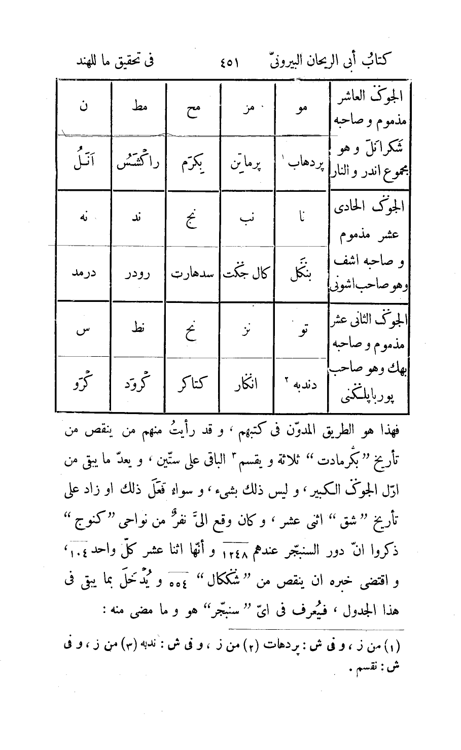 الأيّام تتفاضل في التعظيم بسبب صفات تنضاف اليها كالأحد فإنّه عند الهند بسبب الشمس وبسبب ابتداء الأسبوع فيه معظّم كالجمعة في الاسلام، ومن الأيّام المعظّمة «اوماس» و «بورنمة» اعني يوم الاجتماع والاستقبال وسببهما انّهما غايتان لنور القمر في الفناء والامتلاء، ويعتقدون في هذه الزيادة والنقصان انّ البراهمة يديمون قرابين النار للثواب، فيجتمع انصباء الملائكة ممّا تطعم بالالقاء فيها عند القمر ومن الاجتماع الى الاستقبال، ثم يؤخذ في تفرقته على الملائكة وتوزيعه من عند الاستقبال حتى ابلغ الاجتماع لم يبق منه بقيّة وقد قلنا ايضا انّهما نصفا نهار الآباء وليلهم، فيكون التصدق فيهما دائما هو للآباء دائما ومنها اربعة ايّام تعظّم لأنّه كان فيها زعموا مداخل الجوكات الأربعة في «جترجوك» الذي نحن فيه وهي اليوم الثالث من «بيشاك» ويسمّى «كشيريتا» وفيه زعموا دخل «كرتاجوك» ، واليوم التاسع من «كارتك» وفيه دخل «تريتاجوك» واليوم الخامس عشر من «ماك» وفيه دخل «دوابر» ، واليوم الثالث عشر من «اشوجج» وفيه دخل «كلجوك» ؛ وعلى ما اظنّ هي اعياد بأسماء الجوكات موضوعة وضعا للصدقات او إقامة شيء من الرسوم كذكارين «1» النصارى، فأمّا ان يكون دخول الجوكات فيها بالحقيقة فلا، امّا