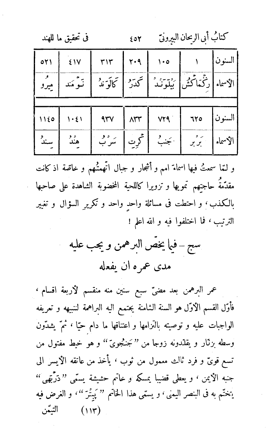 كرتاجوك فأمره ظاهر لأنّه مبدأ ادوار الشمس والقمر لا ينكسر من احوالها شيء لأنّه مبدأ جترجوك، فهو أوّل شهر «جيتر» ووقت الاعتدال الربيعيّ معا وكذلك سائر الجوكات كلّ واحد على رأي صاحبه، لأنّ عند «برهمكوبت» ايّام جترجوك الطلوعيّة 1577916450، وشهور الشمس فيه 51840000، وشهور «ادماسه» 1593300، وأيّام القمر 1602999000، وأيّام «اونراتر» 25082550، وهذه هي الأشياء التي بها يجري التحليل والتركيب في التواريخ، ومدار امر الجوكات عنده على الأعشار ولكلّ واحد من هذه الأعداد عشر صحيح، فحال مبادئ الجوكات حال مبدأ جترجوك، وأمّا عند «بلس» فإنّ ايّام جترجوك الطلوعيّة 1577917800، وشهور الشمس فيه 51840000، وشهور ادماسه 1593336، وأيّام القمر 1603000010، وأيام «اونراتر» 25082280، ومدار امر الجوكات عنده على الأرباع ولكلّ واحد من هذه الأعداد ربع صحيح، فمبادىء الجوكات كمبدأ «جترجوك» لا يزول عن اوّل «جيتر» وعن الاستواء الربيعي، وإنّما يختلف في الأسبوع، فلا وجه اذن لما يذكرونه إلّا ان يأخذوا فيه بتأويل؛ والأوقات التي يكتسب فيها الثواب تسمّى «بنّكال» ، وقد قال «بلبهدر» في تفسيره لكندكاتك: لو أنّ رجلا جوكيّا وهو الزاهد الذي عقل البارئ وآثر الخير وكفّ عن السوء ثابر على سيرته الوف سنين لم يحلق ثوابه ثواب من تصدّق في بنّكال وأقام شروطه من الاغتسال والتدهّن والصلاة والتسابيح، ولا محالة انّ اكثر الأعياد المتقدّمة تكون من هذا الجنس، فإنّها للصدقات والضيافات، ولو لم تكن مرجوّة لما استحسن فيها الفرح والاستبشار، ثمّ من بنّكال ما يكون مسعودة مع ذلك، ومنها ما يكون منحوسة، فمن المسعودة انتقالات الكواكب من برج الى برج وخاصّة انتقال الشمس، وتسمّى هذه الأوقات «سنكرانت» ومختارها الاعتدالان والانقلابان، وأفضلها الاستواء الربيعيّ ويسمّى «بخو» و «بشو «1» »
