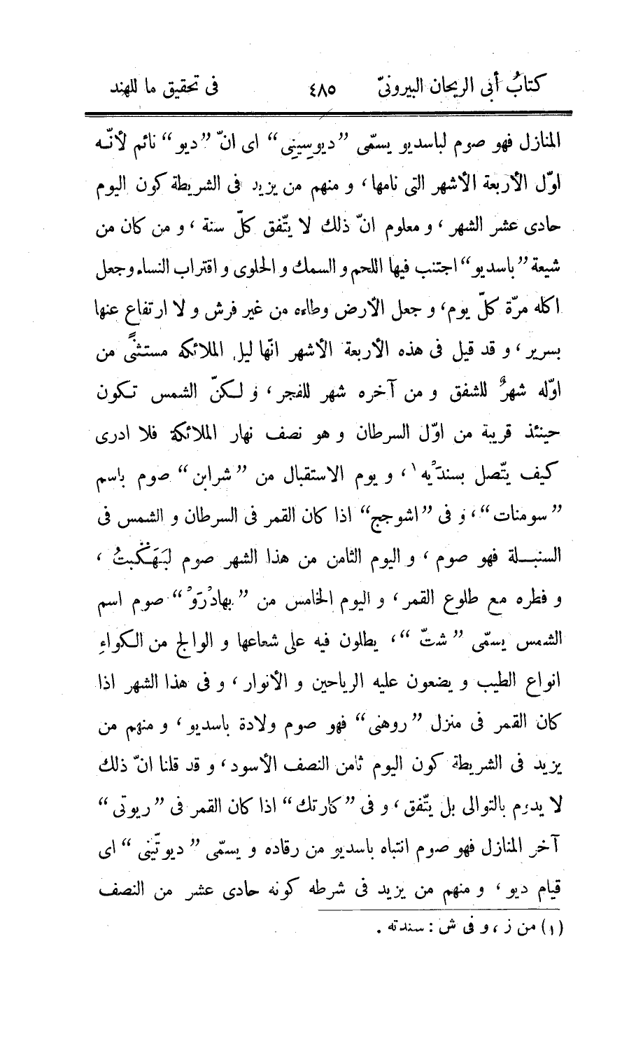 وهذه هي الأصول التي عليها بالحقيقة مدار احكام النجوم أعني الكواكب والبروج والبيوت، والمقتدر على تخريج «1» دلالاتها مستحقّ سمة التخرّج والمقدّم في صناعته؛ ويتلوها تقسّم البروج الى الأجزاء وأوّلها النيمبهرات وتسمّى «هور» باسم الساعة، لأنّ طلوع نصف البرج يكون في قريب من ساعة، والنصف الأوّل من كلّ برج ذكر يكون للنحس من النيّرين أعني الشمس بسبب التذكير والأخير للسعد منهما بسبب التأنيث وهو القمر وذلك في البروج الإناث بالعكس؛ ثمّ الاثلاث وتسمّى «دريكان» ، ولا فائدة في ذكرها لأنّها التي تسمّى عندنا «دريجانات» بعينها، ثمّ النهبهرات وتسمّى «نوانشك» ، ولأنّها في كتب المداخل عندنا على نوعين فإنّا نذكر ما عليه الهند لنعرف المحرّص عليهم، وهو أن يجعل من أوّل البرج الى الدقيقة التي تراد معرفة نهبهرها دقائق كلّه ويقسم على مائتين «2» ، فتخرج اتساع تامّة معدودة من البرج المنقلب الذي في مثلّث ذلك البرج على التوالي لكلّ تسع برج فالذي ينتهي اليه نوبة الكسر يكون صاحب النهبهر المطلوب، ويسمّى التسع الأوّل من كلّ برج منقلب والخامس من كلّ ثابت والتاسع من كلّ ذي جسدين «پركوتم» أي أعظم الحظوظ؛ ثمّ الاثنا عشريّات وتسمّى «دوازدسايس» ، ومعرفتها للموضع المفروض من البرج أن يجعل من أوّله اليه دقائق كلّه ويقسم المبلغ على مائة وخمسين، فيخرج انصاف اسداس تامّة معدودة من ذلك البرج على التوالي لكلّ برج واحد فالذي ينتهي اليه الكسر يكون ربّه ربّ اثنا عشريّة ذلك الموضع؛ وبعد ذلك الدرجات وتسمّى «تري شانش» أي الدرجات الثلاثين بمنزلة الحدود عندنا، ونظامها أن يكون للمرّيخ من أوّل كلّ برج ذكر خمسة أجزاء ثمّ لزحل مثلها وللمشتري ثمانية ولعطارد سبعة وللزهرة خمسة، وأمّا البروج الإناث فيعكس فيها الترتيب المذكور أعني
