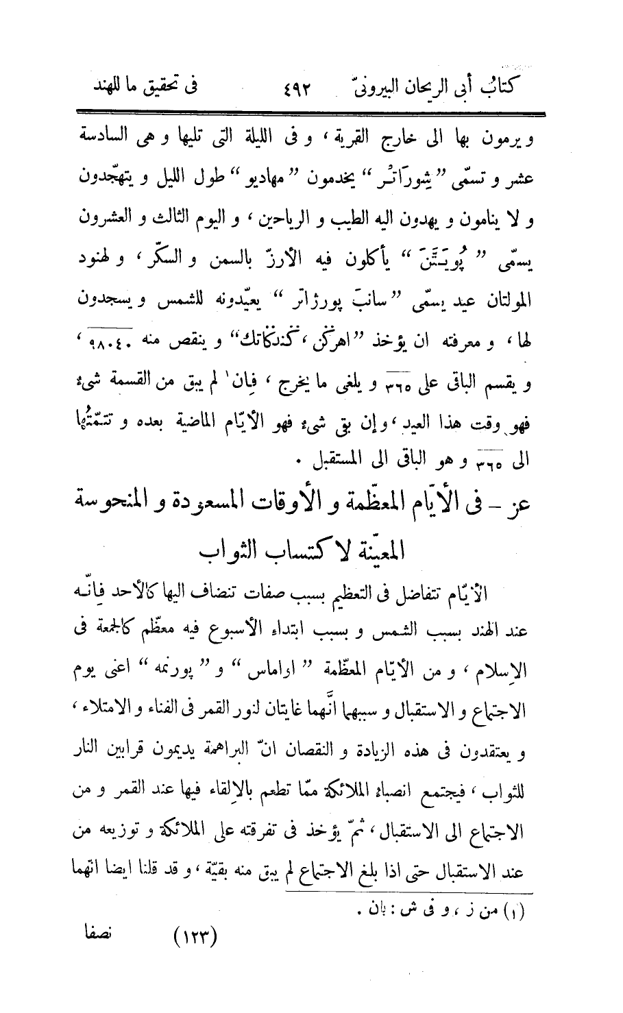 وإنّما حكيت هذا ليعلم تباين طرق قومنا وطرق الهند في أحكام النجوم، وأمّا طرقهم في أحداث الجوّ والعالم فمع طولها ركيكة جدّا، وكما اقتصرنا من أمر المواليد على ذكر الأعمار كذلك نقتصر من هذا الفنّ على نوع المذنّبات من قول المظنون به منهم فضل تحصيل ليقاس بها ما وراءه، ونقول أنّ اسم رأس الجوزهر «هوراه» واسم ذنبه «كيت» ، وقلّ ما يذكر الهند الذنب وإنّما يستعملون الرأس وحده، وجميع الكواكب المذنّبة الحادثة في الجوّ تسمّى أيضا «كيت» بالتعميم، قال «براهمهر» : أنّ للرأس ثلاثة وثلاثون أبناء يسمّون «تامسيلك» ، وهم أنواع المذنّبات سواءا امتدّ منهم أو لم يمتدّ، والحكم عليها