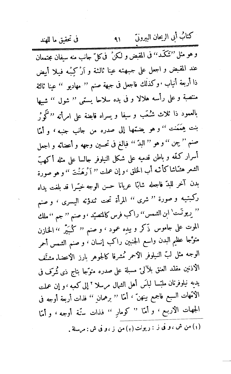 ففيه القرابين والأوامر والنواهي ويقرأ بلحن كالغناء وبذلك سمّي، فإنّ «سام» هو طيبة الحديث وسبب الحانه أنّ «ناراين» لما جاء بصورة «بامن» وأتى «بل» الملك جعل نفسه «برهمنا» وأخذ في قراءة سام بيذ بلحن شجيّ أطربه به حتى كان من أمره ما كان؛ وأمّا «أثربن» فهو متّصل ليس من النظمين الأوّلين ولكنّه من ثالث يسمّى «بهر» ويقرأ بلحن مع غنّة، ورغبة الناس فيه أقلّ، وفيه أيضا قرابين النار وأوامر في الموتى وما يجب أن يعمل بهم. وأمّا «الپرانات» وتفسير «پران» الأوّل القديم، فإنّها ثمانية عشر وأكثرها مسمّاة بأسماء حيوانات وأناس وملائكة بسبب اشتمالها على أخبارهم أو بسبب نسبة الكلام فيها أو الجواب عن المسائل إليها، وهي من عمل القوم المسمّين «رشين» والذي كان عندي منها مأخوذا من الأفواه بالسماع فهي: «آدبران» أي الأوّل و «مج پران» أي السمكة و «كورم پران» أي السلحفاة و «براه پران» أي الخنزير و «نارسك پران» أي الإنسيّ الذي رأسه رأس أسد و «بامن پران» أي الرجل المتقلّص الأعضاء بصغرها و «باج پران» أي الريح و «نندپران» وهو خادم لمهاديو و «اسكند پران» وهو ابن «مهاديو» و «آدت پران» و «سوم پران» وهما النّيران و «سانب پران» وهو ابن «بشن» وبرهماند پران» وهو السماوات و «ماركنديو پران» وهو «رش» كبير و «تاركش پران» وهو العنقاء و «بشن پران» وهو «ناراين» و «براهم پران» وهو الطبيعة الموكّلة بالعالم و «ببّش پران» وهو ذكر الكائنات في المستأنف؛ وما رأيت منها غير قطع من «مجّ» «وآدت» و «باج» ؛ ثمّ قرئت عليّ من بشن پران على هيئة أخرى فأثبتّها أيضا كالواجب فيما مرجعه إلى الأخبار وهي: «براهم» «بذم» أي النيلوفر الأحمر «بشن» «شب» وهو «مهاديو» «بهكبت» أي «باسديو» «نارذ» وهو ابن «براهم» «ماركنديو» «آكن» وهو النار «بهبّش» وهو ما سيكون «برهم بيبرت»