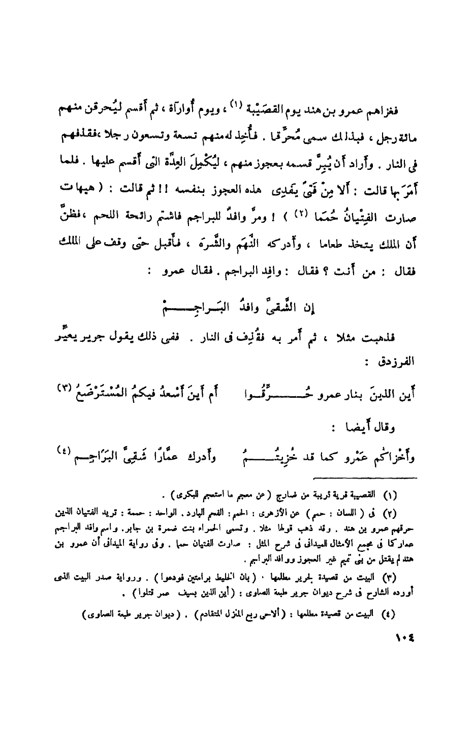 فغزاهم عمرو بن هند يوم القصيبة، ويوم أواراة ثم أقسم ليحرقن منهم مائة رجل، فبذلك سمى محرقاً. فأخذ لهم منه تسعة وتسعون رجلاً، فقذفهم في النار. وأراد أن يبر قسمه بعجوز منهم، ليكمل العدة التي أقسم عليها. فلما أمر بها قالت: ألا من فتى يفدى هذه العجوز بنفسه!! ثم قالت: (هيهات صارت الفتيان حمما)!، وأدركه النهم والشره، فأقبل حتى وقف على الملك فقال: من أنت؟ فقال: وافد البراجم. فقال عمرو: