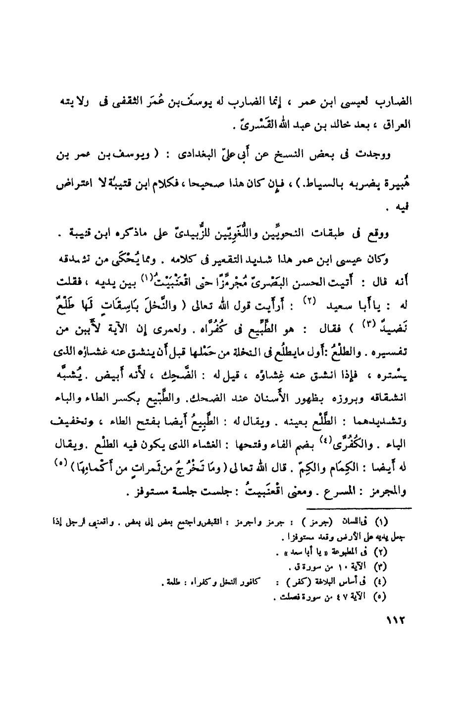 وكان عيسى ابن عمر هذا شديد التقعير في كلامه. ومما يحكى من تشدقه أنه قال: أتيت الحسن البصري مجرمزاً حتى اقعنبيت بين يديه، فقلت له: يا أبا سعيد: أرأيت قول الله تعالى {وَالنَّخْلَ بَاسِقَاتٍ لَّهَا طَلْعٌ نَّضِيدٌ} فقال: هو الطبيع في كفراه. ولعمري إن الآية لأبين من تفسيره. والطلع: أول ما يطلع في النخلة من حملها قبل أن ينشق عنه غشاؤه الذي يستره، فإذا انشق عنه غشاؤه، قيل له: الضحك، لأنه أبيض يشبه انشقاقه وبروزه بظهور الأسنان عند الضحك. والطبيع بكسر الطاء والباء وتشديدهما: الطلع بعينه. ويقال له: الطبيع أيضاً بفتح الطاء، وتخفيف الباء، والكفرى بضم الفاء وفتحها: الغشاء الذي يكون فيه الطلع. ويقال له أيضاً: الكمام والكم. قال الله تعالى {ومَا تَخْرُجُ مِن ثَمَرَاتٍ مِّنْ أَكْمَامِهَا} والمجرمز: المسرع. ومعنى اقعنبيت: جلست جلسة مستوفز.