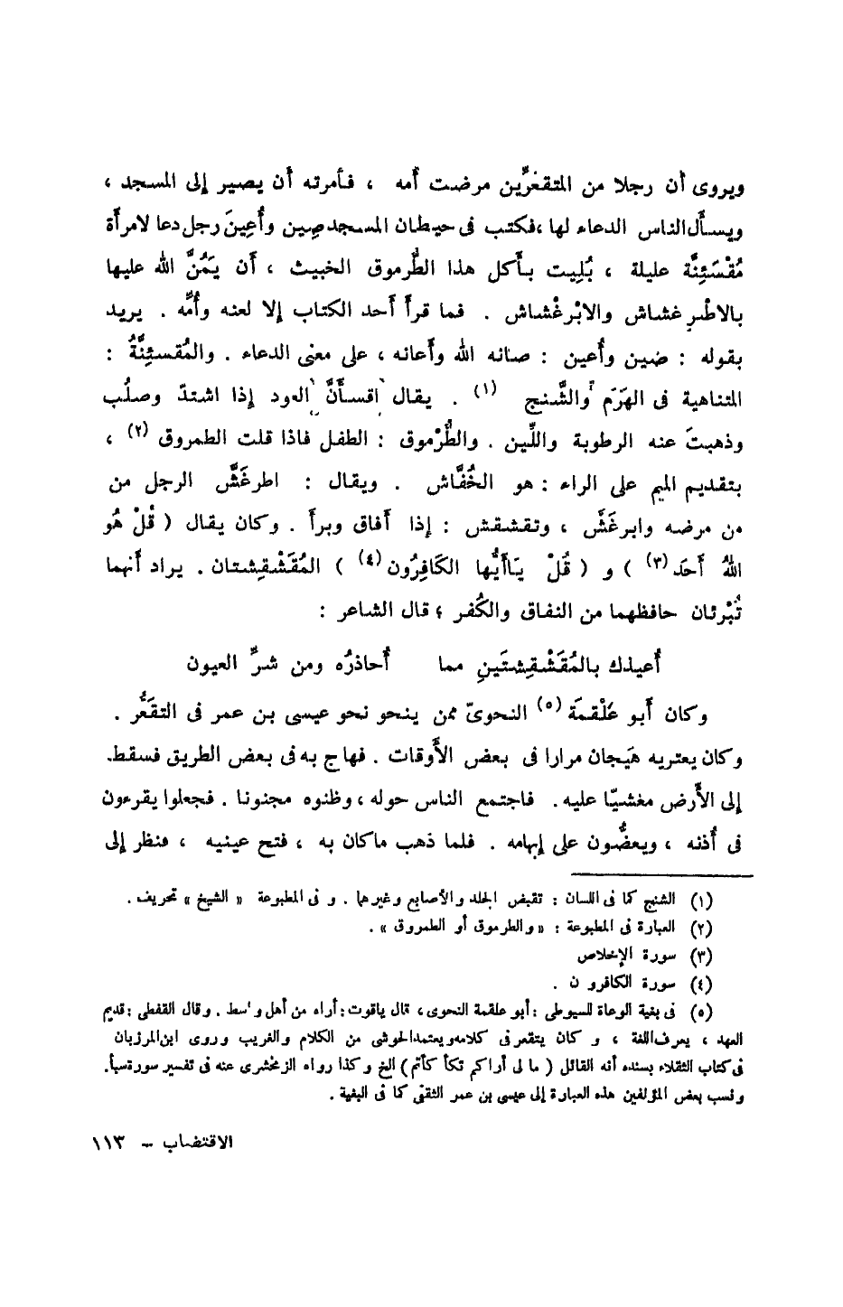 ويروى أن رجلاً من المتقعرين مرضت أمه، فأمرته أن يصير إلى المسجد، ويسأل الناس الدعاء لها، فكتب في حيطان المسجد صين وأعين رجل دعا لامرأة مقسئنة عليلة، بليت بأكل هذا الطرموق الخبيث، أن يمن الله عليها بالاطرغشاش والابرغشاش. فما قرأ أحد الكتاب إلا لعنه وأمه. يريد بقوله: صين وأعين: صانه الله وأعانه، على معنى الدعاء. والمقسئنة: المتناهية في الهرم والشنج. يقال اقسأن العود إذا اشتد وصلب وذهبت عنه الرطوبة واللين والطرموق: الطفل فإذا قلت الطمروق، بتقديم الميم على الراء: هو الخفاش. ويقال: اطرغش الرجل من من مرضه وابرغش، وتقشقش: إذا أفاق وبرأ. وكان يقال {قُلْ هُو اللهُ أَحَد} و {قٌلْ يَا أَيُّها الكَافِرُون} المقشقشتان. يراد أنهما تبرئان حافظهما من النفاق والكفر، قال الشاعر: