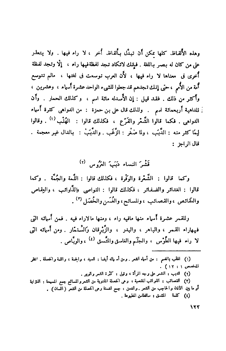 وهذه الألفاظ كلها يمكن أن تبدل بألفاظ آخر، لا راء فيها. ولا يتعذر على من كان له بصر باللغة فإنك لا تكاد تجد لفظة فيها راء، إلا وتجد لفظة أخرى في معناها لا راء فيها، لأن العرب توسعت في لغتها، ما لم تتوسع أمة من الأمم، حتى إنك تجدهم قد جعلوا للشيء الواحد عشرة أسماء، وعشرين، وأكثر من ذلك. فقد قيل: إن الأسدله مائة اسم، وكذلك الحمار. وأن للداهية أربعمائة اسم. ولذلك قال علي بن حمزة: من الدواهي كثرة أسماء الدواهي. فكما قالوا الشعر والفرع، فكذلك قالوا: الهلب. وقالوا لما كثر منه: الدبب، ولما صغر: الزغب. والدبب: بالدال غير معجمة. قال الراجز: