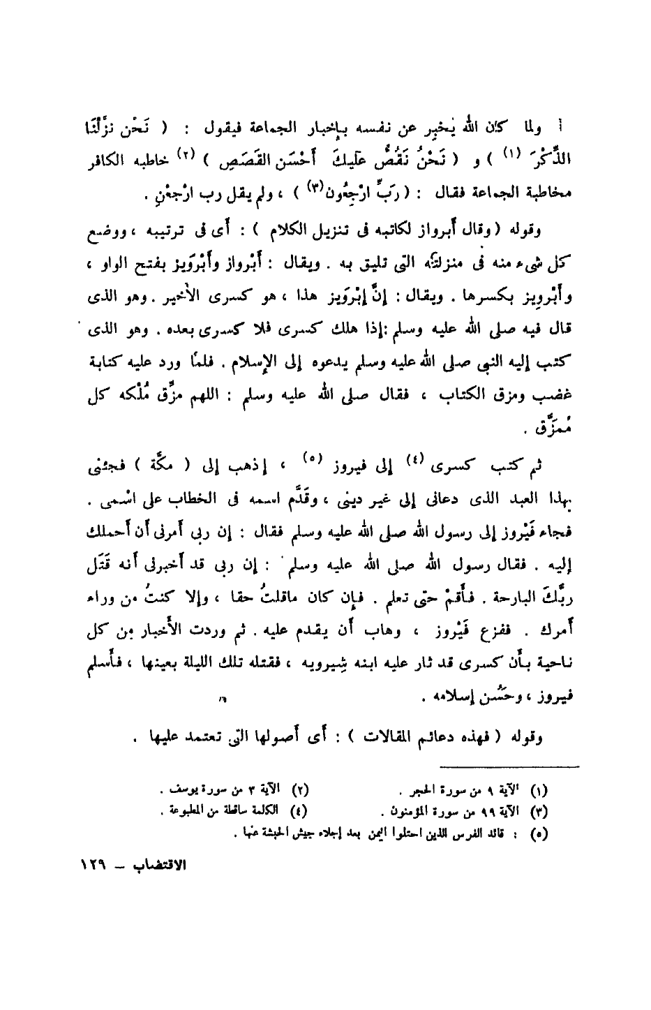 وقوله (وقال أبرواز لكاتبه في تنزيل الكلام): أي في ترتيبه، ووضع كل شيء منه في منزلته التي تليق به. ويقال: أبرواز وأبرويز بفتح الواو، وأبرويز بكسرها. ويقال: إن إبرويز هذا، هو كسرى الأخير. وهو الذي قال فيه صلى الله عليه وسلم: إذا هلك كسرى فلا كسرى بعده. وهو الذي كتب إليه النبي صلى الله عليه وسلم يدعوه إلى الإسلام. فلما ورد ليه كتابة غضب ومزق الكتاب، فقال صلى الله عليه وسلم: اللهم مزق ملكه كل ممزق.