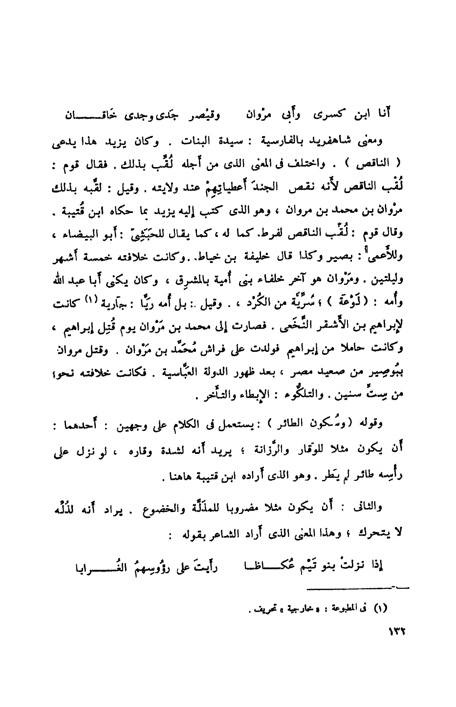 ومعنى شاهفريد بالفارسية: سيدة البنات. وكان يزيد هذا يدعى (الناقص). واختلف في المعنى الذي من أجله لقب بذلك. فقال قوم: لقب الناقص لأنه نقص الجند أعطياتهم عند ولايته. وقيل: لقبه بذلك مروان بن محمد بن مروان، وهو الذي كتب إليه يزيد بما حكاه ابن قتيبة. وقال قوم: لقب الناقص لفرط. كما له، كما يقال للحبشي: أبو البيضاء، وللأعمى: بصير وكذا قال خليفة بن خياط. وكانت خلافته خمسة أشهر وليلتين. ومروان هو آخر خلفاء بني أمي بالمشرق، وكان يكني أبا عبد الله وأمه: (لوعة)، سرية من الكرد،. وقيل: بل أمه ريا: جارية كانت لإبراهيم بن الأشقر النخعي. فصارت إلى محمد بن مروان يوم قتل إبراهيم، وكانت حاملاً من إبراهيم فولدت على فراش محمد بن مروان. وقتل مروان ببوصير من صعيد مصر، بعد ظهور الدولة العباسية. فكانت خلافته نحواً من ست سنين. والتلكوء: الإبطاء والتأخر.
