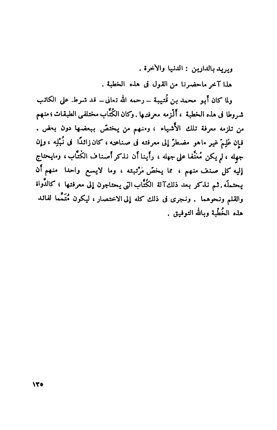 ولما كان أبو محمد بن قتيبة- رحمه الله تعالى- قد شرط على الكاتب شروطاً في هذه الخطبة، ألزمه معرفتها وكان الكتاب مختلفي الطبقات، منهم من تلزمه معرفة تلك الأشياء، ومنهم من يختص ببعضها دون بعض. فإن علم غير ما هو مضطر إلى معرفته في صناعته، كان زائداً في نبله، وإن جهله، لم يكن معنفاً على جهله، رأينا أن نذكر أصناف الكتاب، وما يحتاج إليه كل صنف منهم، مما يخص مرتبته، ما لا يسع واحداً منهم أن يحتمله. ثم نذكر بعد ذلك آلة الكتاب التي يحتاجون إلى معرفتها، كالدواة والقلم ونحوهما. ونجري في ذلك كله إلى الاختصار، ليكون متمماً لفائد هذه الخطبة وبالله التوفيق.