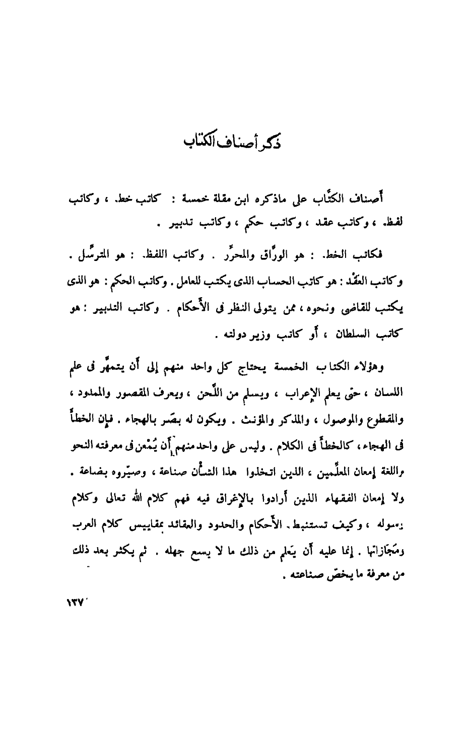 وهؤلاء الكتاب الخمسة يحتاج كل واحد منهم إلى أن يتمهر في علم اللسان، حتى يعلم الإعراب، ويسلم من اللحن، ويعرف المقصور والممدود، والمقطوع والموصول، والمذكر والمؤنث. ويكون له بصر بالهجاء. فإن الخطأ في الهجاء، كالخطأ في الكلام. وليس على واحد منهم أن يمعن في معرفته النحو واللغة إمعان المعلمين، الذين اتخذوا هذا الشأن صناعة، وصيروه بضاعة. ولا إمعان الفقهاء الذين أرادوا بالإغراق فيه فهم كلام الله تعالى وكلام رسوله، وكيف تستنبط الأحكام والحدود والعقائد بمقاييس كلام العرب ومجازاتها. إنما عليه أن يعلم من ذلك ما لا يسع جهله. ثم يكثر بعد ذلك من معرفة ما يخص صناعته.