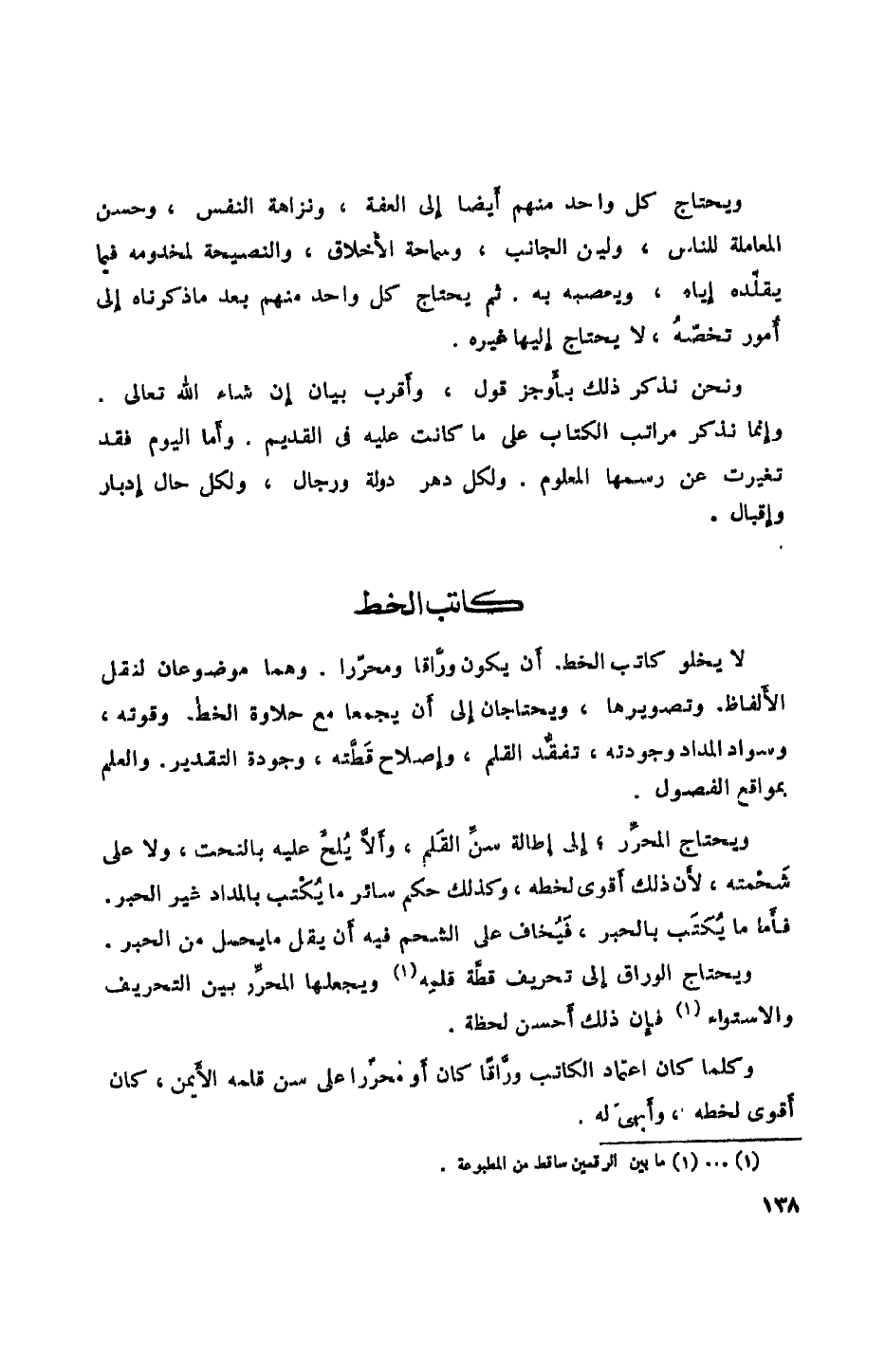 لا يخلو كاتب الخط. أن يكون وراقاً ومحرراً. وهما موضوعان لنقل الألفاظ وتصويرها، ويحتاجان إلى أن يجمعا مع حلاوة الخط وقوته، وسواد المداد وجودته، تفقد القلم، وإصلاح قطته، وجودة التقدير. والعلم بمواقع الفصول.