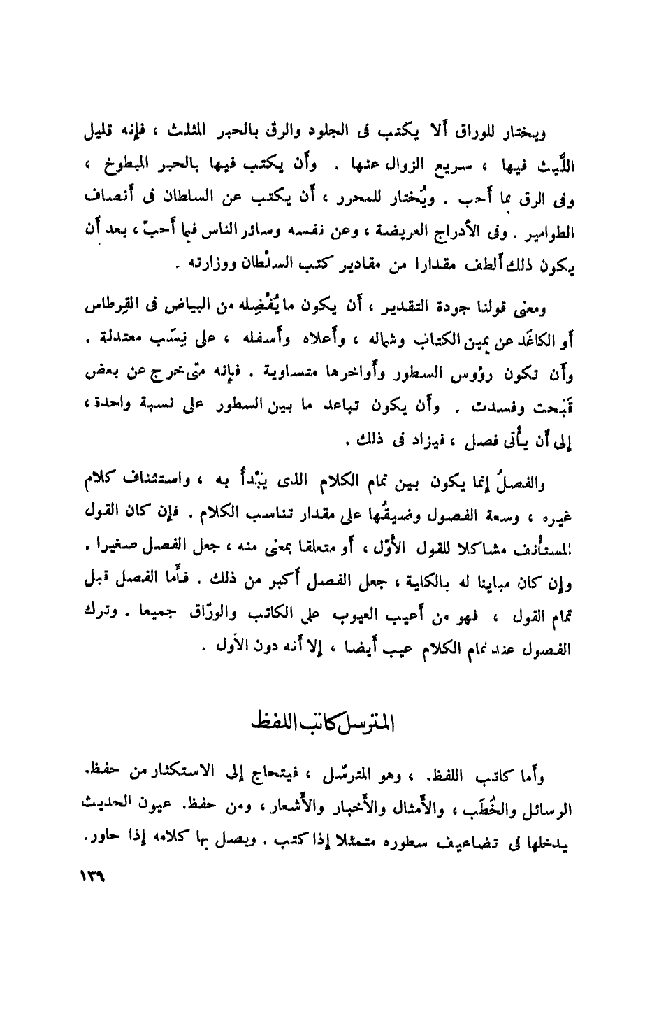 والفصل إنما يكون بين تمام الكلام الذي يبدأ به، واستئناف كلام غيره، وسعة الفصول وضيقها على مقدار تناسب الكلام. فإن كان القول المستأنف مشاكلاً للقول الأول، أو متعلقاً بمعنى منه، جعل الفصل صغيراً. وإن كان مبايناً له بالكلية، جعل الفصل أكبر من ذلك. فأما الفصل قبل تمام القول، فهو من أعيب العيوب على الكاتب والوراق جميعاً. وترك الفصول عند تمام الكلام عيب أيضاً، إلا أنه دون الأول.