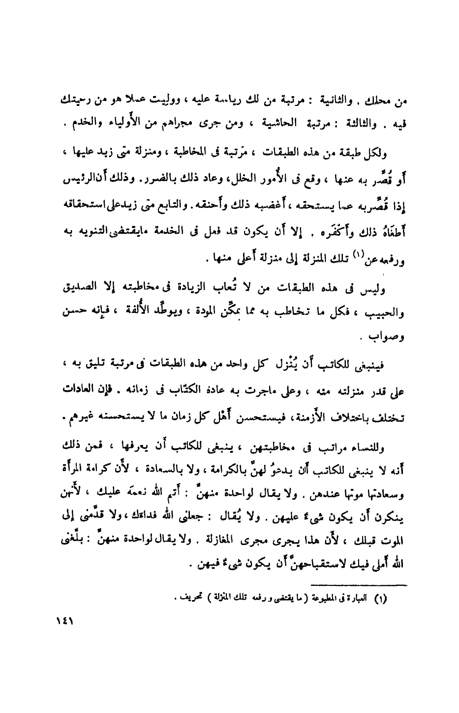 فينبغي للكاتب أن ينزل كل واحد من هذه الطبقات في مرتبة تليق به، على قدر منزلته منه، وعلى ما جرت به عادة الكتاب في زمانه. فإن العادات تختلف اختلاف الأزمنة، فيستحسن أهل كل زمان لا يستحسنه غيرهم.