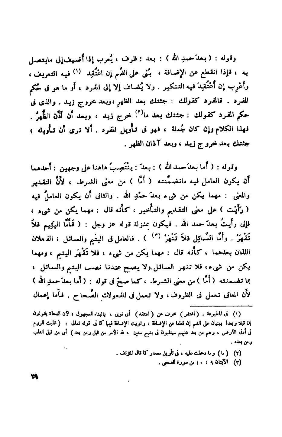 وقوله: (أما بعد حمد الله): بعد: ينتصب هاهنا على وجهين: أحدهما أن يكون العامل فيه ما تضمنته (أما) من معنى الشرط، لأن التقدير والمعنى: مهما يكن من شيء بعد حمد الله. والثاني أن يكون العامل فيه (رأيت) على معنى التقديم والتأخير، كأنه قال: مهما يكن من شيء، فإني رأيت بعد حمد الله. فيكون بمنزلة قوله عز وجل: (فأما اليتيم فلا تقهر. وأما السائل فلا تنهر). فالعامل في اليتيم والسائل، الفعلان اللذان بعدهما، كأنه قال: مهما يكن من شيء، فلا تقهر اليتيم، ومهما يكن من شيء، فلا تنهر السائل. ولا يصح عندنا نصب اليتيم والسائل، بما تضمنته (أما) من معنى الشرط، كما صح في قوله: (أما بعد حمد الله) لأن المعاني تعمل في الظروف، ولا تعمل في المفعولات الصحاح. فأما إعمال