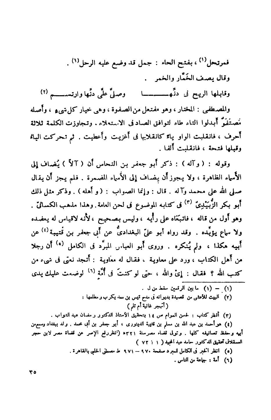وقوله: (وآله): ذكر أبو جعفر بن النحاس أن (آلا) يضاف إلى الأسماء الظاهرة، ولا يجوز أن يضاف إلى الأسماء المضمرة. فلم يجز أن يقال صلى الله على محمد وآله. قال: وإنما الصواب: (وأهله). وذكر مثل ذلك أبو بكر الزبيدي في كتابه الموضوع في لحن العامة. وهذا مذهب الكسائي. وهو أول من قاله، فاتبعاه على رأيه، وليس بصحيح، لأنه لا قياس له يعضده ولا سماع يؤيده. وقد رواه أبو علي البغدادي عن أبي جعفر بن قتيبة عن أبيه هكذا، ولم ينكره. وروى أبو العباس المبرد في الكامل أن رجلاً من أهل الكتاب، ورد على معاوية، فقال له معاوية: أتجد نعتي في شيء من كتب الله؟ فقال: إي والله، حتى لو كنت في أمة لوضعت عليك يدي