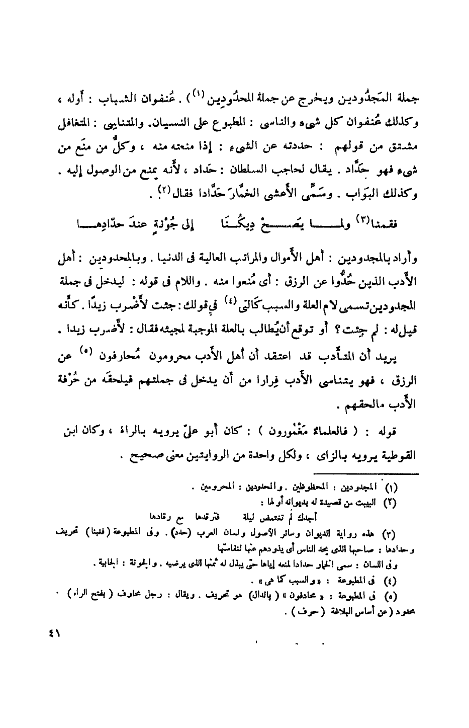 جملة المجدودين ويخرج عن جملة المحدودين). عنفوان الشباب: أوله، وكذلك عنفوان كل شيء والناسي: المطبوع على النسيان. والمتناسي: المتغافل مشتق من قولهم: حددته عن الشيء: إذا منعته من، وكل من منع من شيء فهو حداد. يقال لحاجب السلطان: حداد، لأنه يمنع من الوصول إليه. وكذلك البواب. وسمى الأعشى الخمار حداداً فقال.