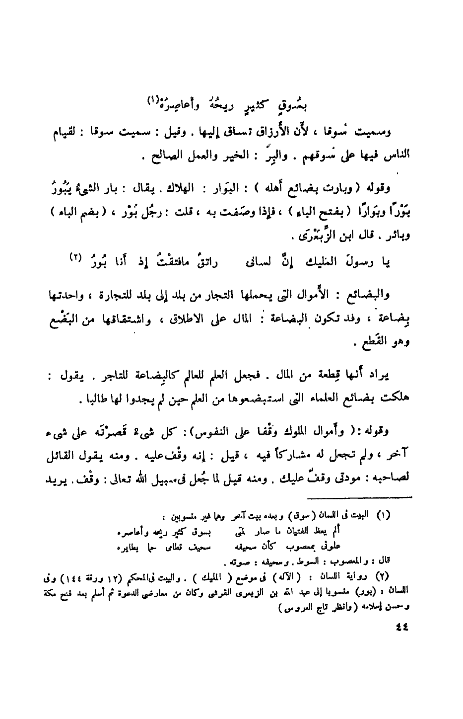 وقوله (وبارت بضائع أهله): البوار: الهلاك. يقال: بار الشيء يبور بوراً وبواراً (بفتح الباء)، فإذا وصفت به، قلت: رجل بور، (بضم الباء) وبائر. قال ابن الزبعري.