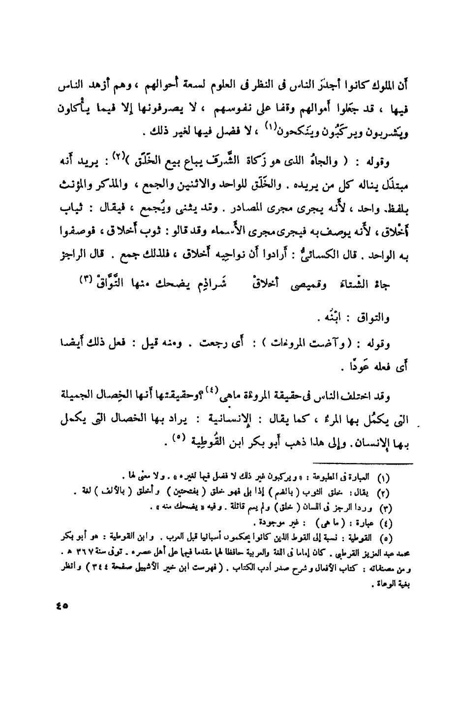 وقد اختلف الناس في حقيقة المروءة ما هي؟ وحقيقتها أنها الخصال الجميلة التي يكمل بها المرء، كما يقال: الإنسانية: يراد بها الخصال التي يكمل بها الإنسان. وإلى هذا ذهب أبو بكر ابن القوطية.