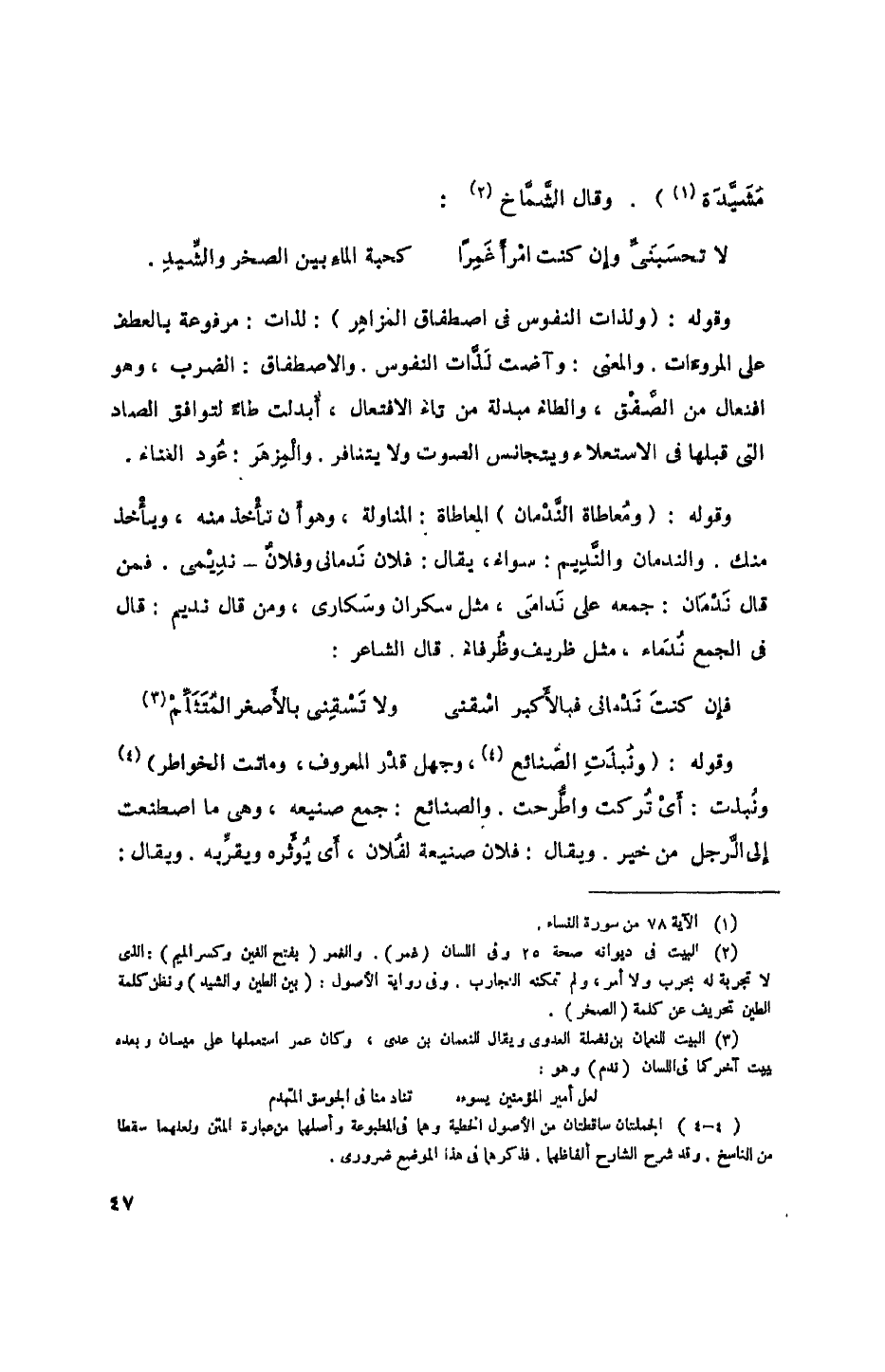 وقوله: (ومعاطاة الندمان) المعاطاة: المناولة، وهو أن تأخذ منه، ويأخذ منك. والندمان والنديم: سواء، يقال: فلان ندماني وفلان- نديمي. فمن قال ندمان: جمعه على ندامي، مثل سكران وسكارى، ومن قال نديم: قال في الجمع ندماء، مثل ظريف وظرفاء. قال الشاعر: