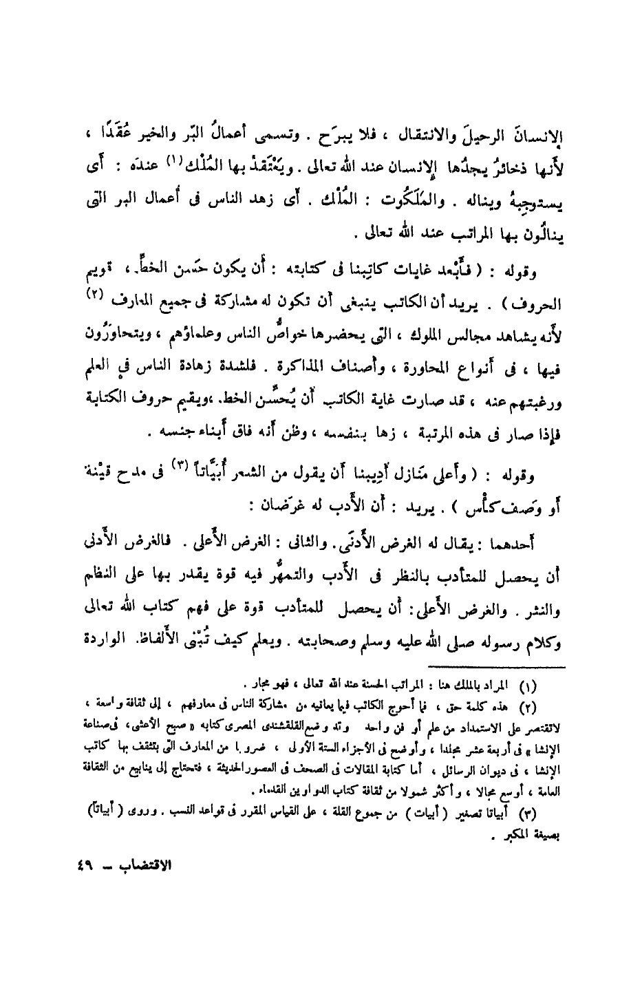 وقوله: (فأبعد غايات كاتبنا في كتابته: أن يكون حسن الخط، قويم الحروف). يريد أن الكاتب ينبغي أن تكون له مشاركة في جميع المعارف لأنه يشاهد مجالس الملوك، التي يحضرها خواص الناس وعلماؤهم، ويتحاورون فيها، في أنواع المحاورة، وأصناف المذاكرة. فلشدة زهادة الناس في العلم ورغبتهم عنه، قد صارت غاية الكاتب أن يحسن الخط، ويقيم حروف الكتابة فإذا صار في هذه المرتبة، زها بنفسه، وظن أنه فاق أبناء جنسه.