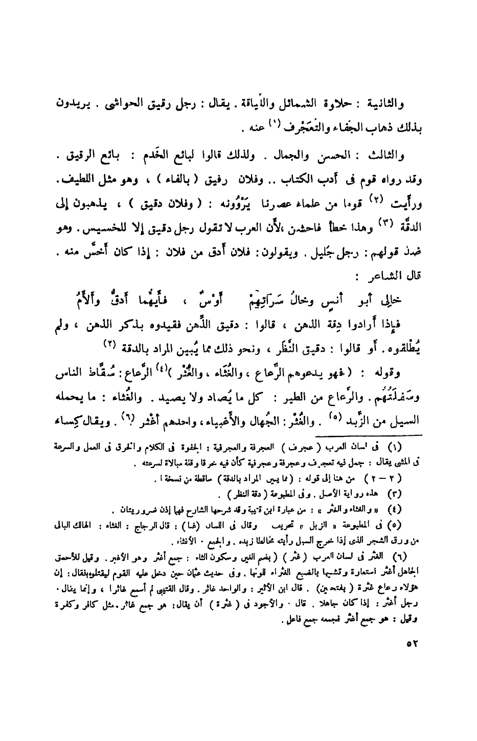 والثالث: الحسن والجمال. ولذلك قالوا لبائع الخدم: بائع الرقيق. وقد رواه قوم في أدب الكتاب .. وفلان رفيق (بالفاء)، وهو مثل اللطيف. ورأيت قوماً من علماء عصرنا يروونه: (وفلان دقيق)، يذهبون إلى الدقة وهذا خطأ فاحش، لأن العرب لا تقول رجل دقيق إلا للخسيس. وهو ضد قولهم: رجل جليل. ويقولون: فلان أدق من فلان: إذا كان أخس منه. قال الشاعر: