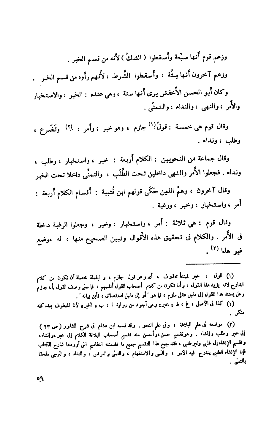 وقال قوم: هي ثلاثة: أمر، واستخبار، وخبر، وجعلوا الرغبة داخلة في الأمر. والكلام في تحقيق هذه الأقوال وتبين الصحيح منها، له موضع غير هذا.